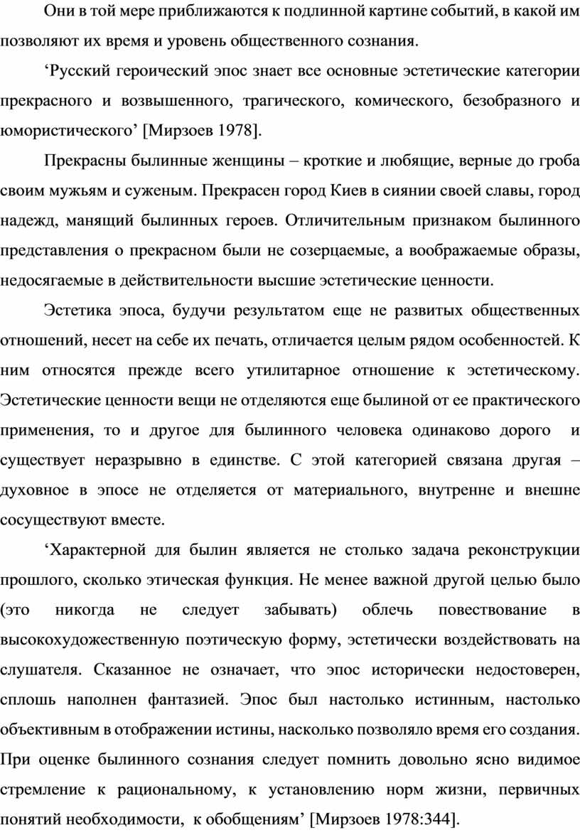 ‘Русский героический эпос знает все основные эстетические категории прекрасного и возвышенного, трагического, комического, безобразного и юмористического’ [Мирзоев 1978].