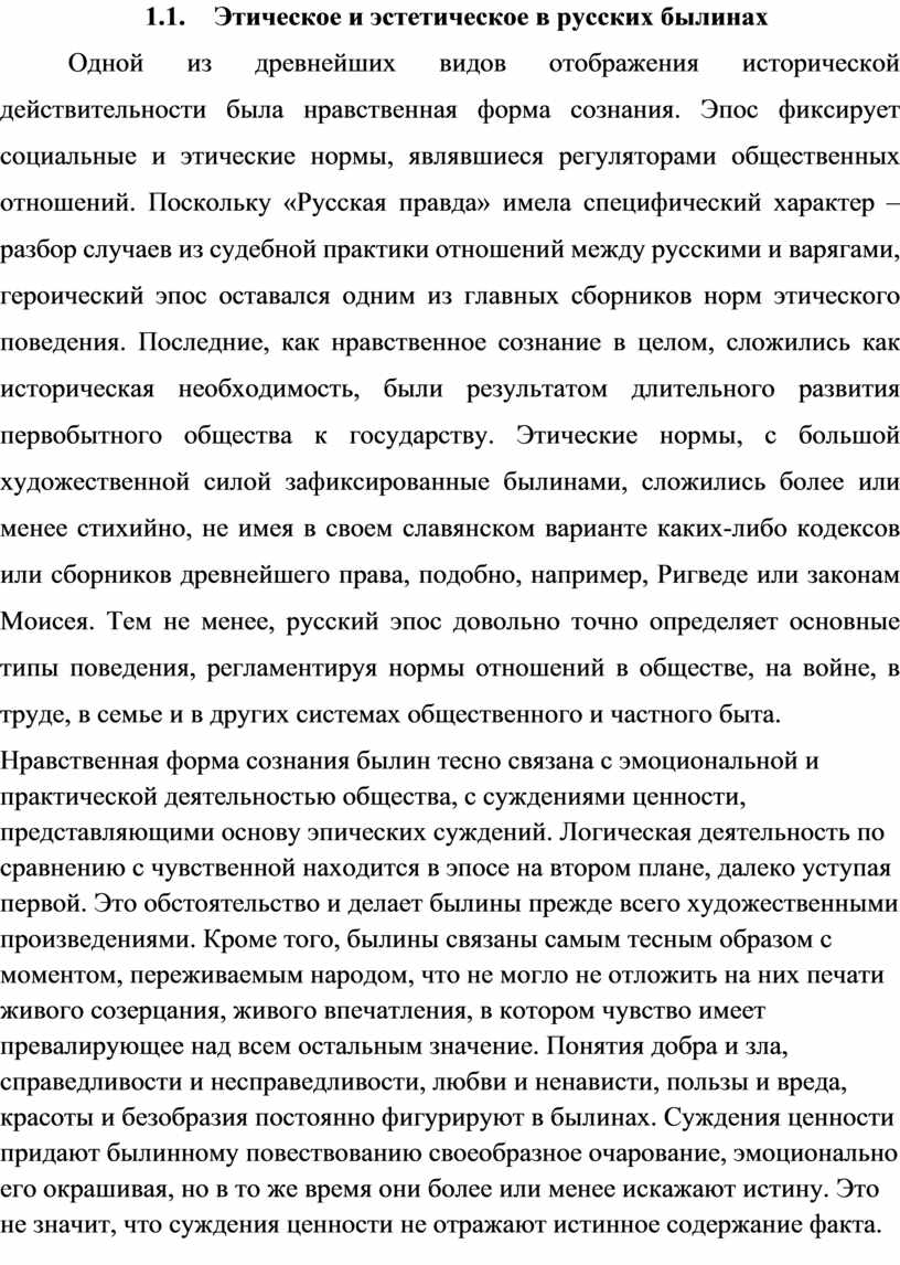Одной из древнейших видов отображения исторической действительности была нравственная форма сознания. Эпос фиксирует социальные и этические нормы, являвшиеся регуляторами общественных отношений. Поскольку «Русская правда» имела специфический характер – разбор случаев из судебной практики отношений между русскими и варягами, героический эпос оставался одним из главных сборников норм этического поведения. Последние, как нравственное сознание в целом, сложились как историческая необходимость, были результатом длительного развития первобытного общества к государству. Этические нормы, с большой художественной силой зафиксированные былинами, сложились более или менее стихийно, не имея в своем славянском варианте каких-либо кодексов или сборников древнейшего права, подобно, например, Ригведе или законам Моисея. Тем не менее, русский эпос довольно точно определяет основные типы поведения, регламентируя нормы отношений в обществе, на войне, в труде, в семье и в других системах общественного и частного быта.
