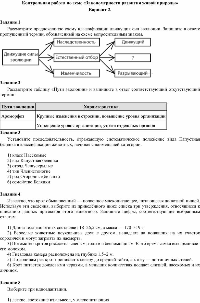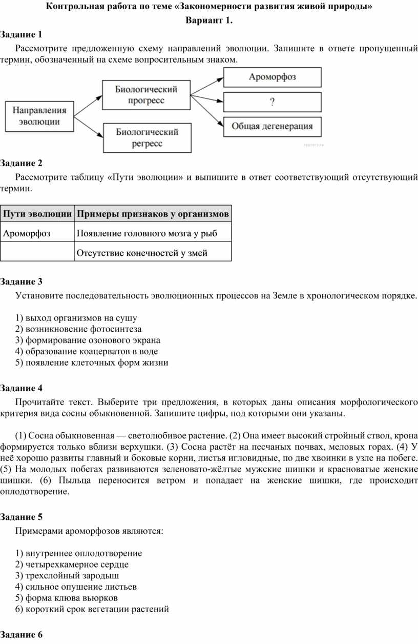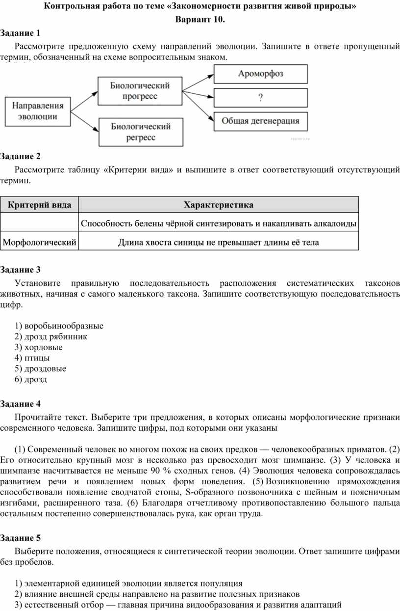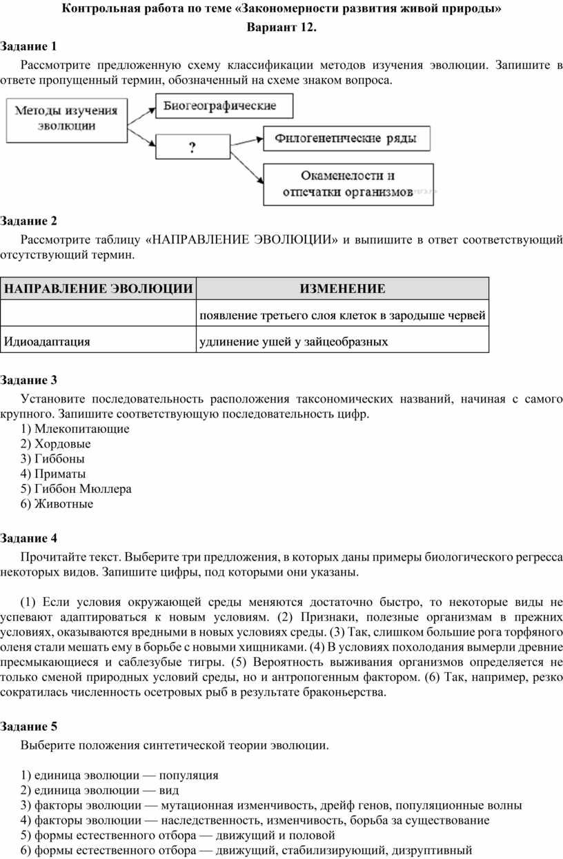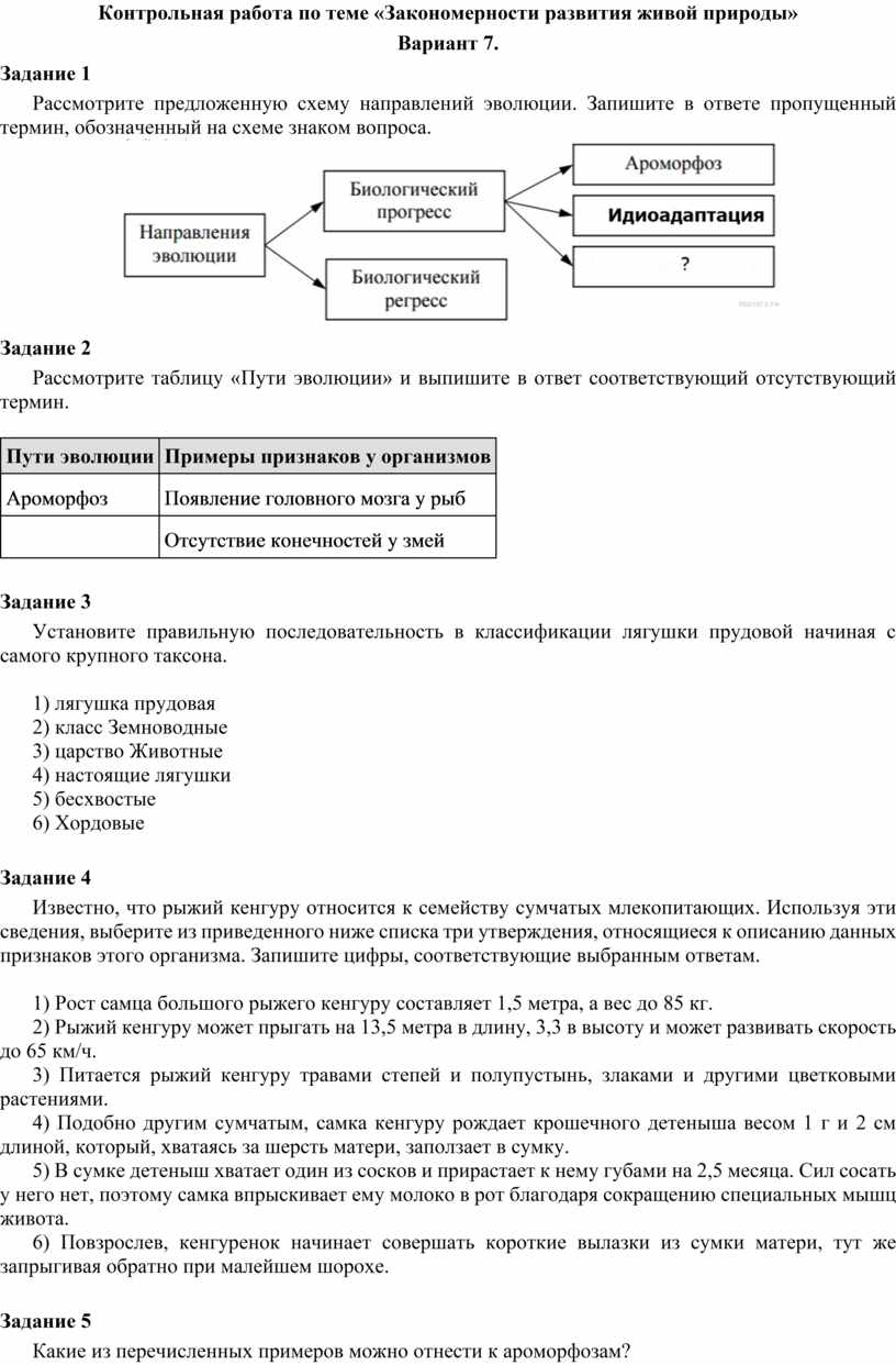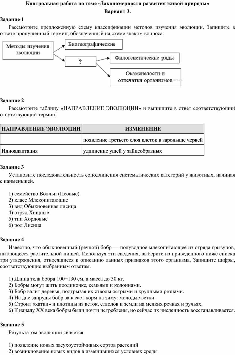 Контрольная работа по теме «Закономерности развития живой природы»