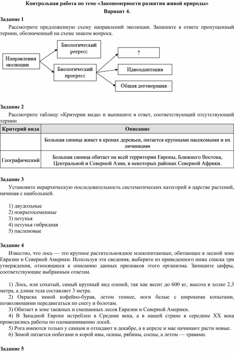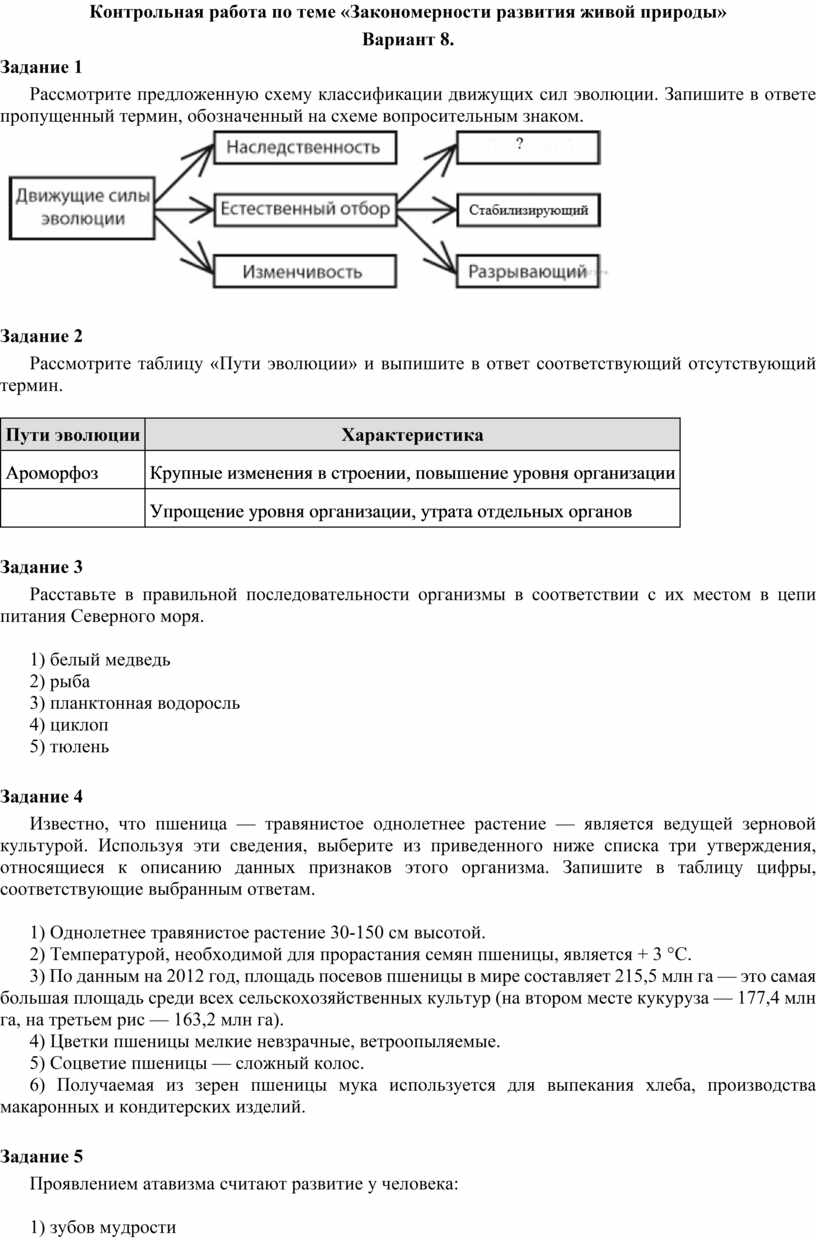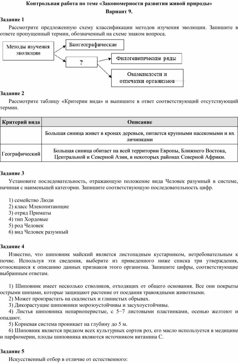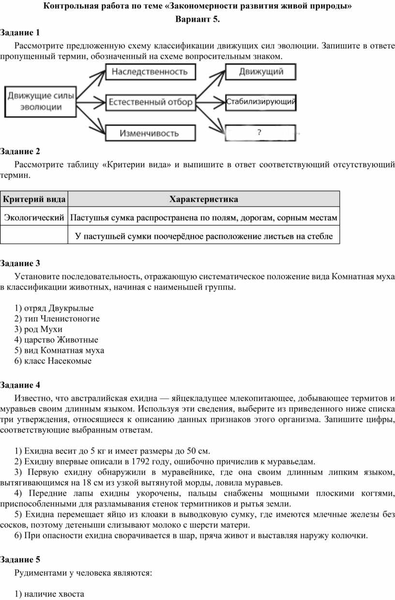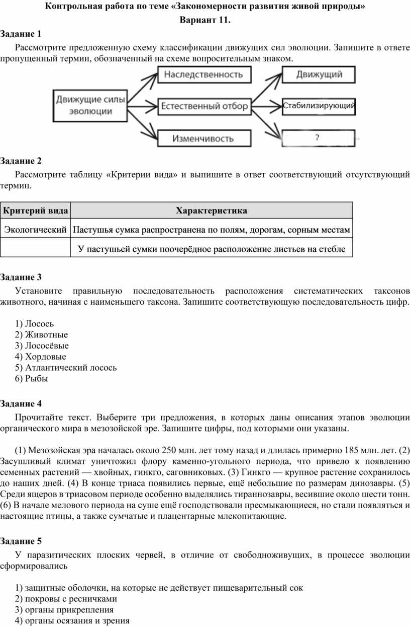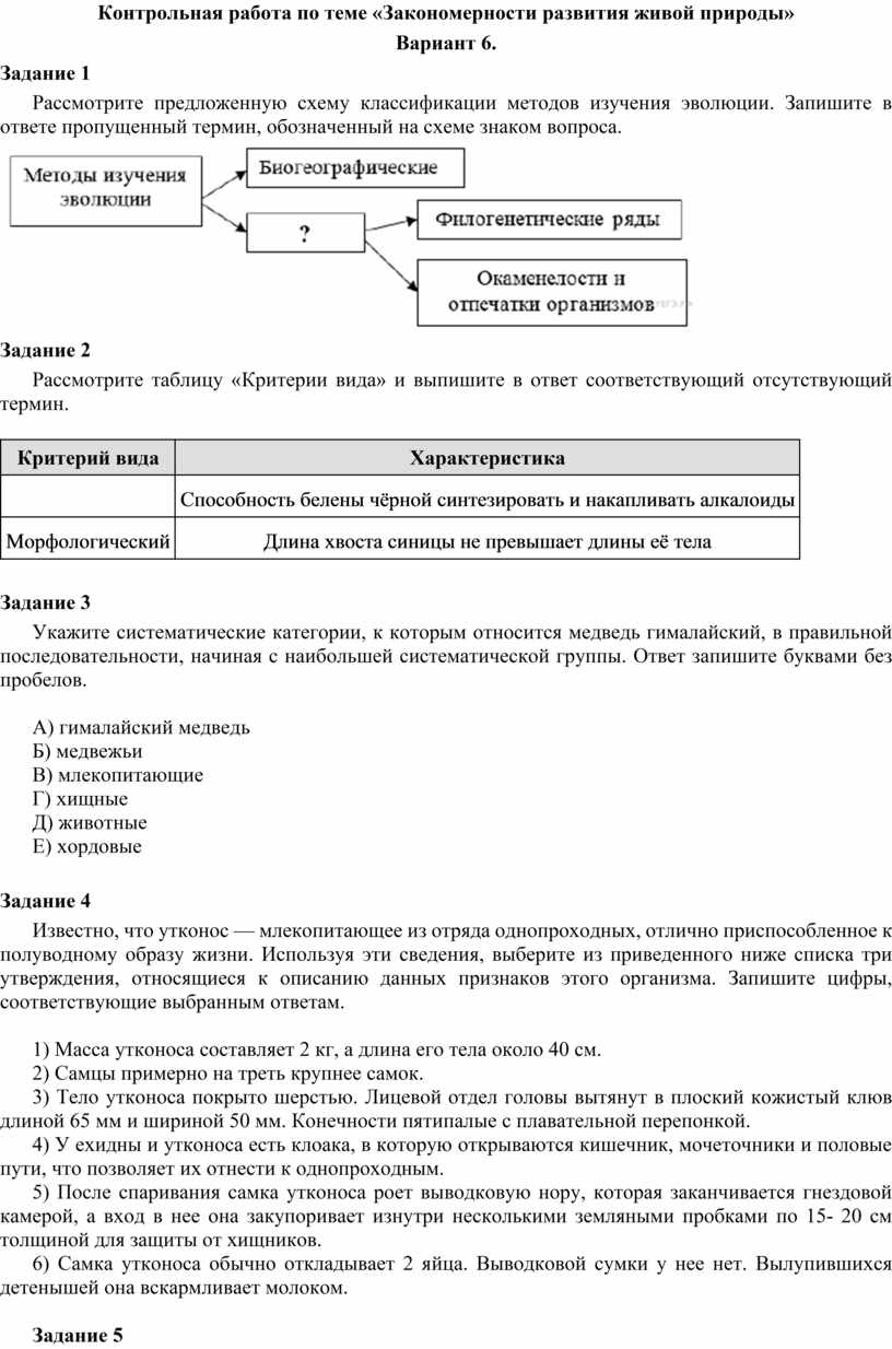 Контрольная работа по теме «Закономерности развития живой природы»