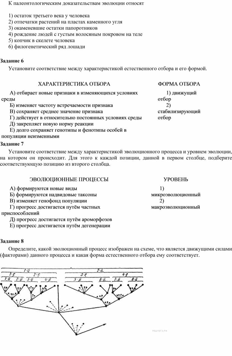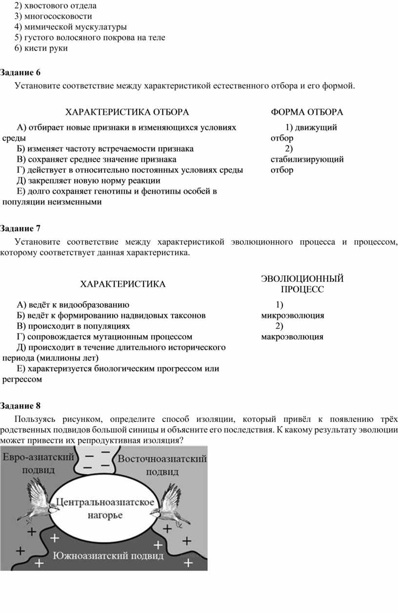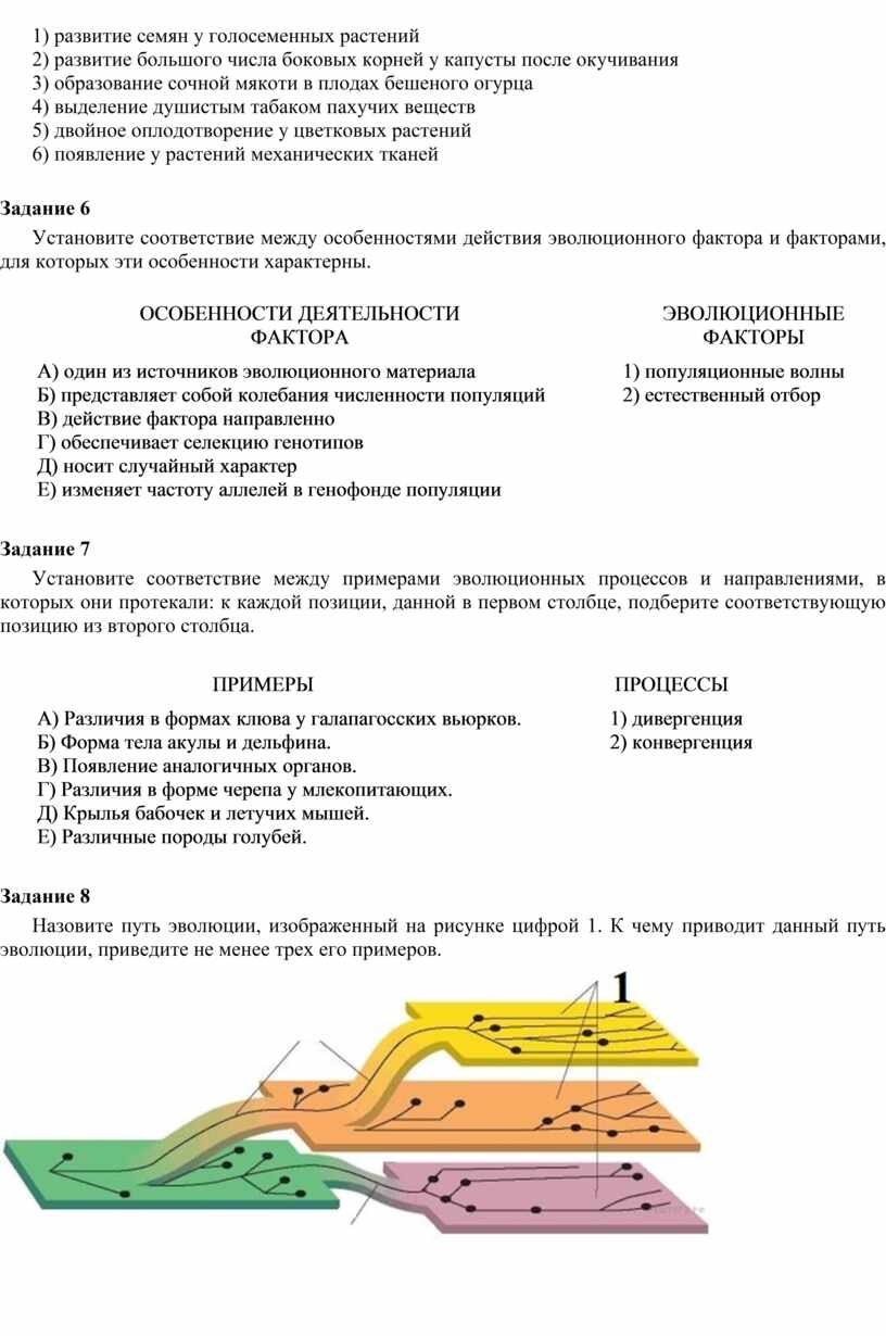 Установите соответствие между характеристикой эволюционного процесса и процессом, которому соответствует данная характеристика.