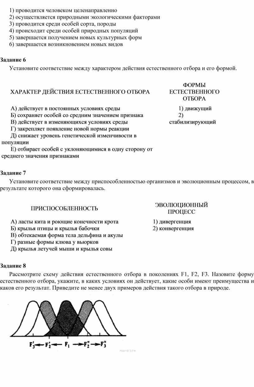 6) формы естественного отбора — движущий, стабилизирующий, дизруптивный