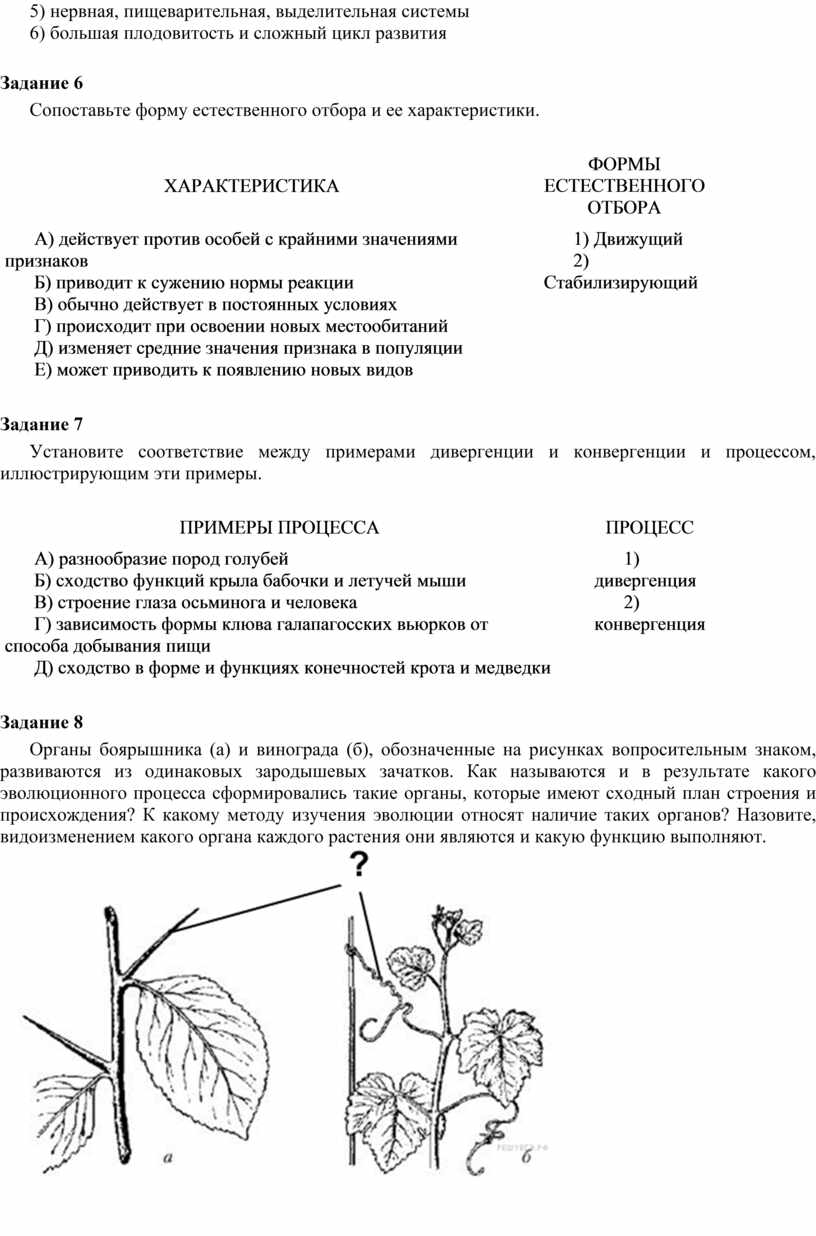 Органы боярышника (а) и винограда (б), обозначенные на рисунках вопросительным знаком, развиваются из одинаковых зародышевых зачатков. Как называются и в результате какого эволюционного процесса сформировались такие органы, которые имеют сходный план строения и происхождения? К какому методу изучения эволюции относят наличие таких органов? Назовите, видоизменением какого органа каждого растения они являются и какую функцию выполняют.