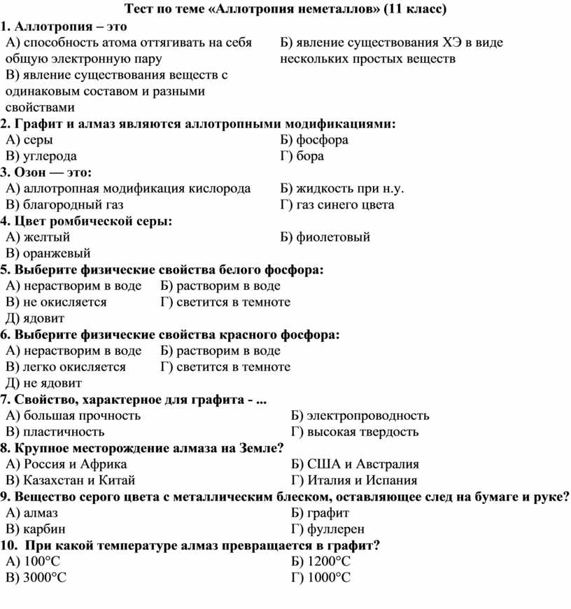 Тест по теме «Аллотропия неметаллов» (11 класс)