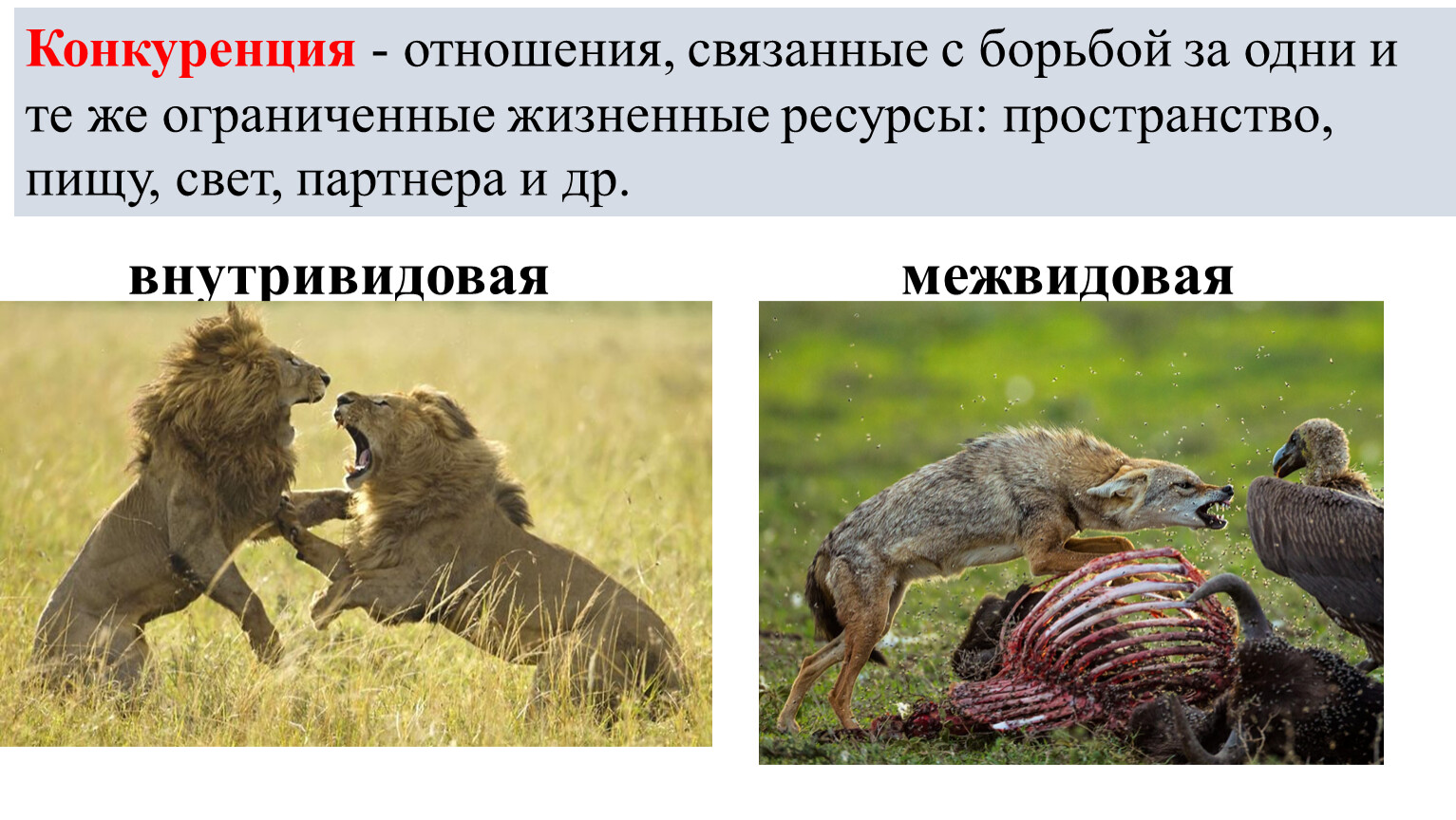 Конкуренция - отношения, связанные с борьбой за одни и те же ограниченные жизненные ресурсы: пространство, пищу, свет, партнера и др.