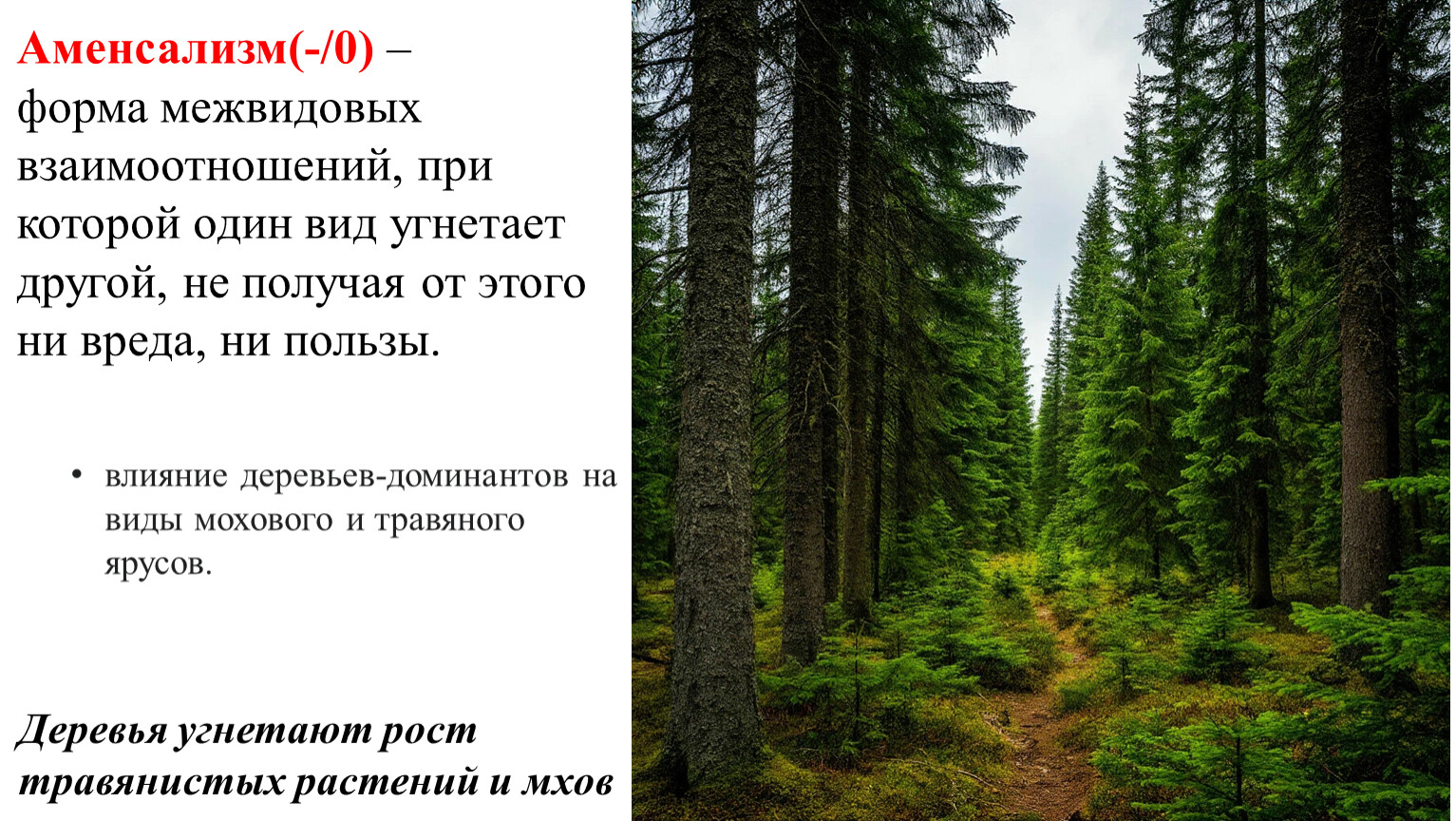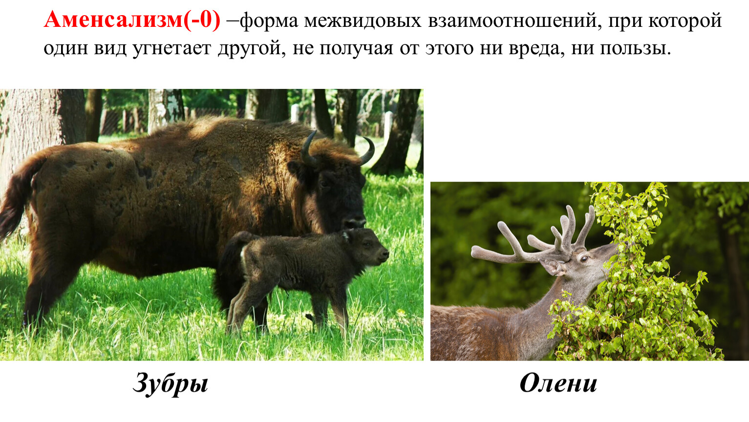 Аменсализм(-0) –форма межвидовых взаимоотношений, при которой один вид угнетает другой, не получая от этого ни вреда, ни пользы.