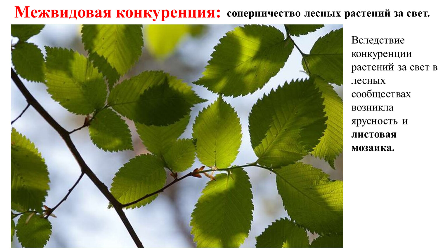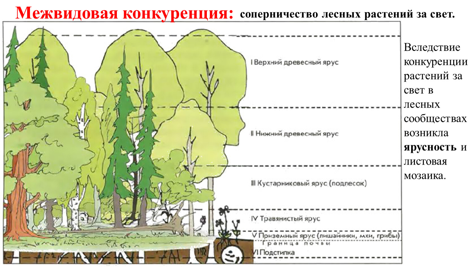 Вследствие конкуренции растений за свет в лесных сообществах возникла ярусность и листовая мозаика.