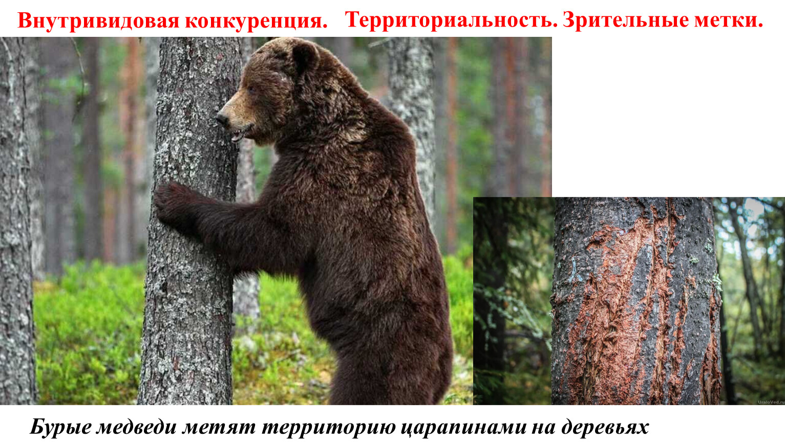 Бурые медведи метят территорию царапинами на деревьях