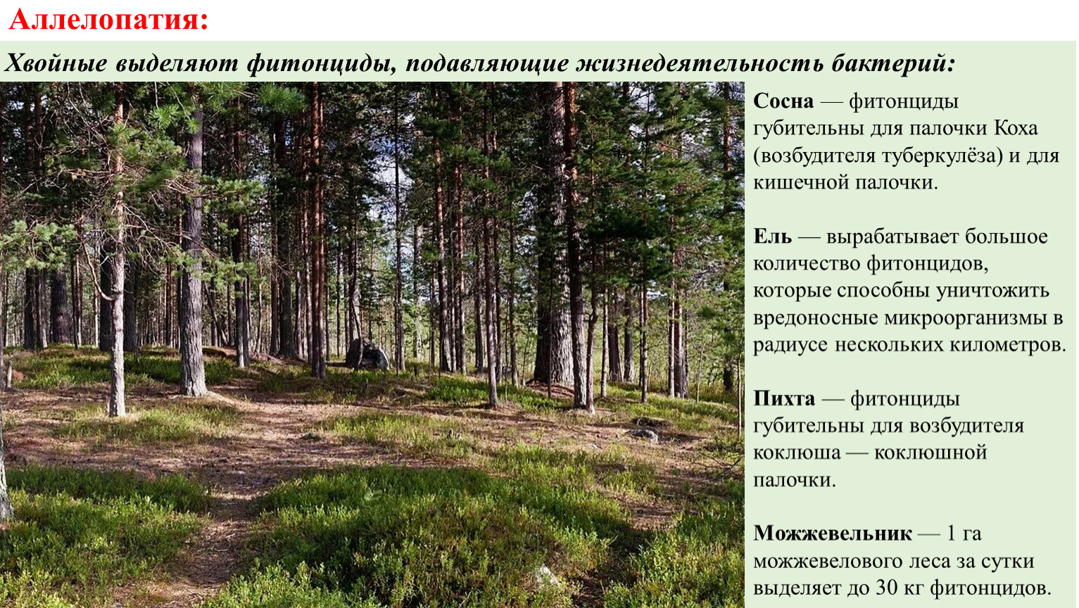 Хвойные выделяют фитонциды, подавляющие жизнедеятельность бактерий: