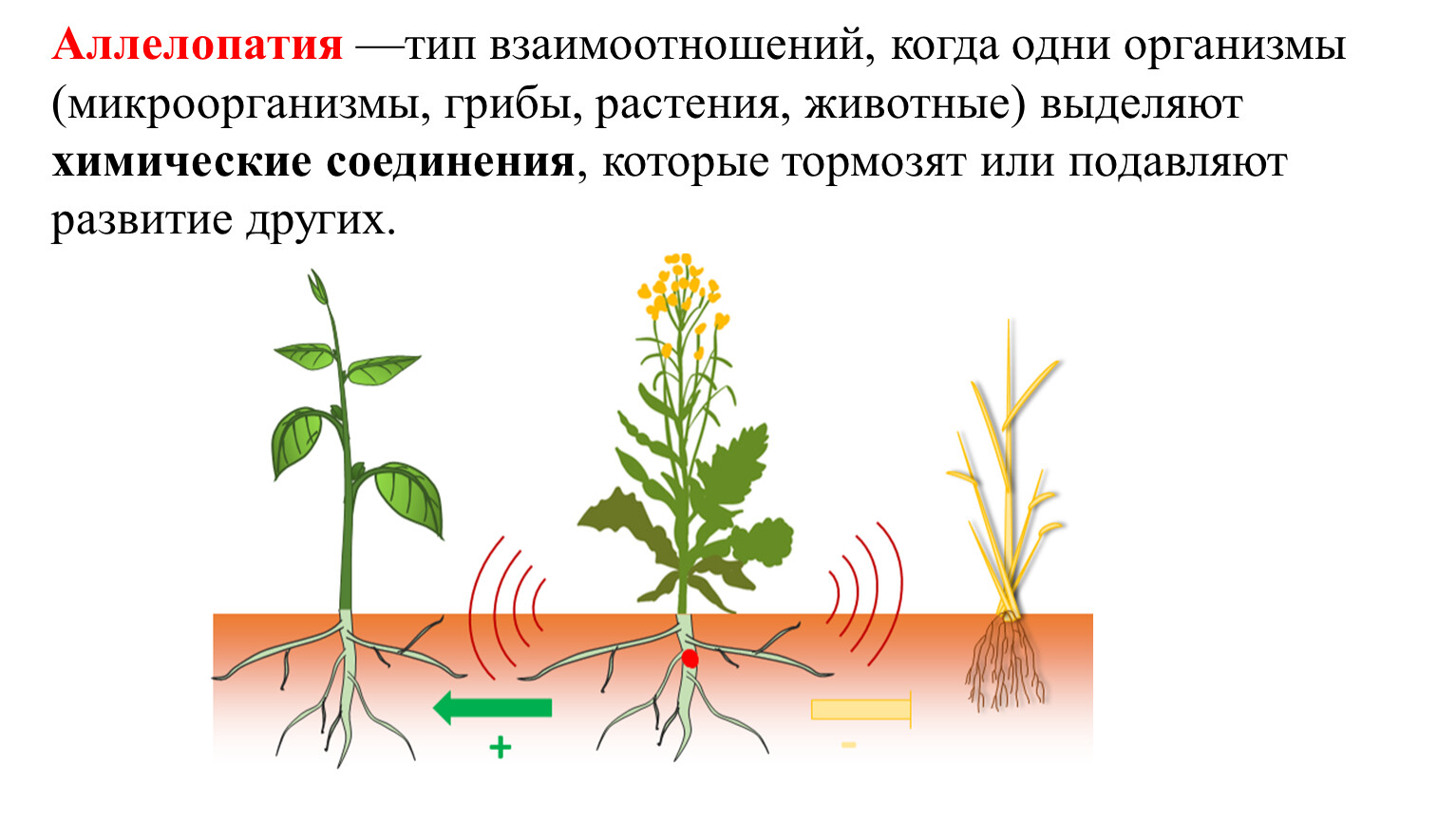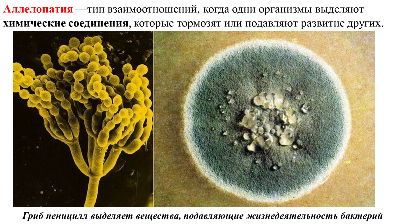 Аллелопатия —тип взаимоотношений, когда одни организмы (микроорганизмы, грибы, растения, животные) выделяют химические соединения, которые тормозят или подавляют развитие других.