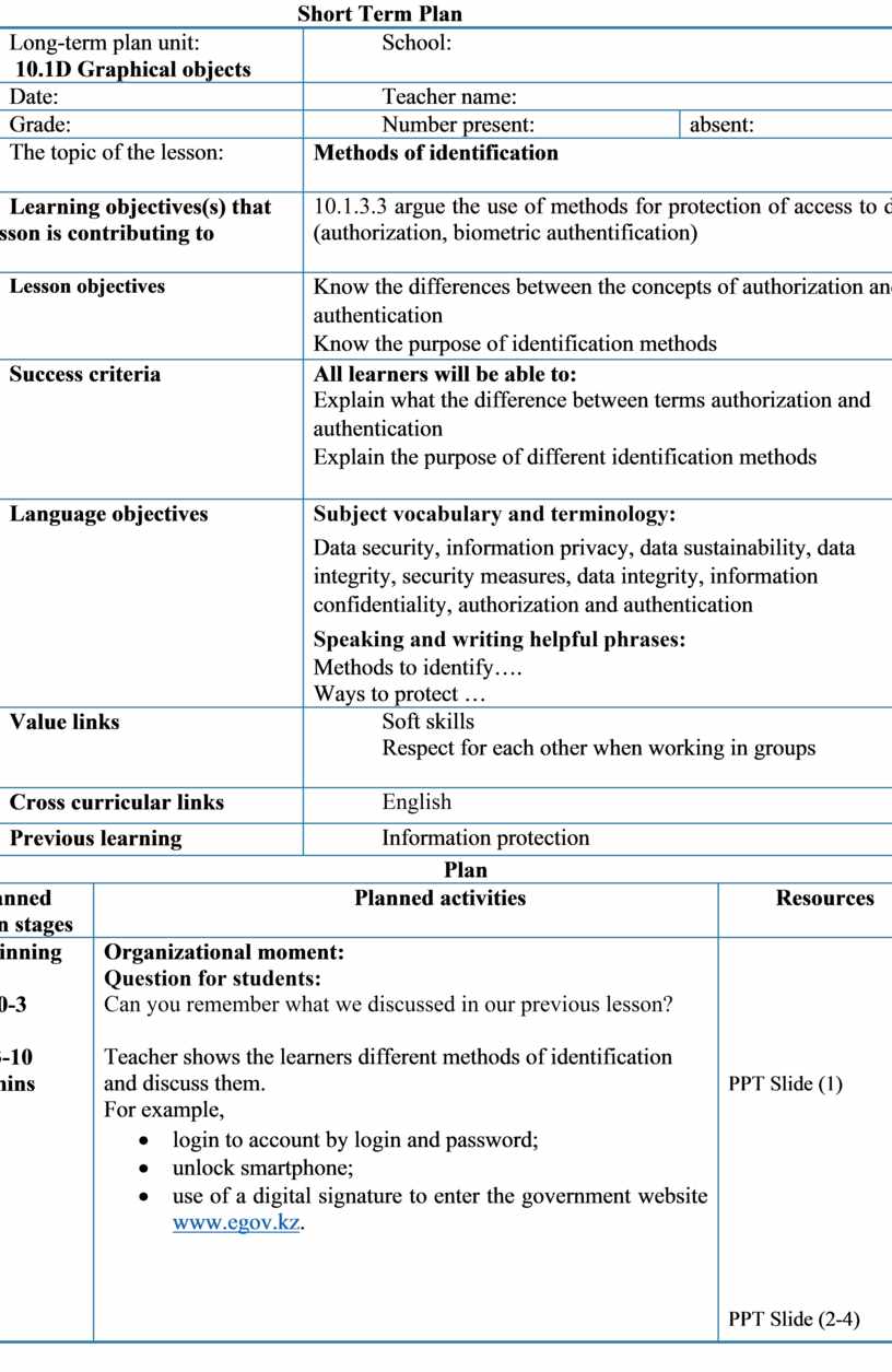 Subject vocabulary and terminology: Data security, information privacy, data sustainability, data integrity, security measures, data integrity, information confidentiality, authorization and authentication Speaking and writing helpful phrases: Methods to identify…. Ways to protect … |