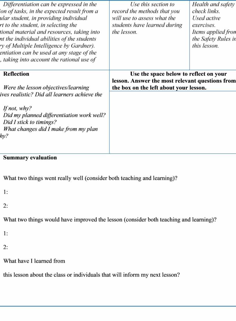 Were the lesson objectives/learning objectives realistic? Did all learners achieve the LO? If not, why? Did my planned differentiation work well? Did I stick to timings? What changes did I make from my plan and why?