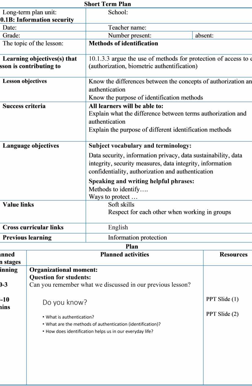 Subject vocabulary and terminology: Data security, information privacy, data sustainability, data integrity, security measures, data integrity, information confidentiality, authorization and authentication Speaking and writing helpful phrases: Methods to identify…. Ways to protect … |