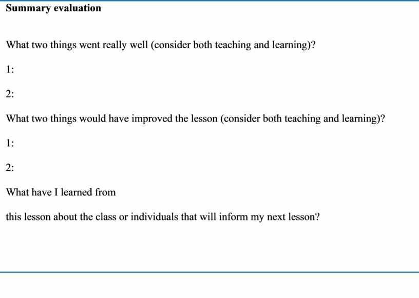 Were the lesson objectives/learning objectives realistic? Did all learners achieve the LO? If not, why? Did my planned differentiation work well? Did I stick to timings? What changes did I make from my plan and why?