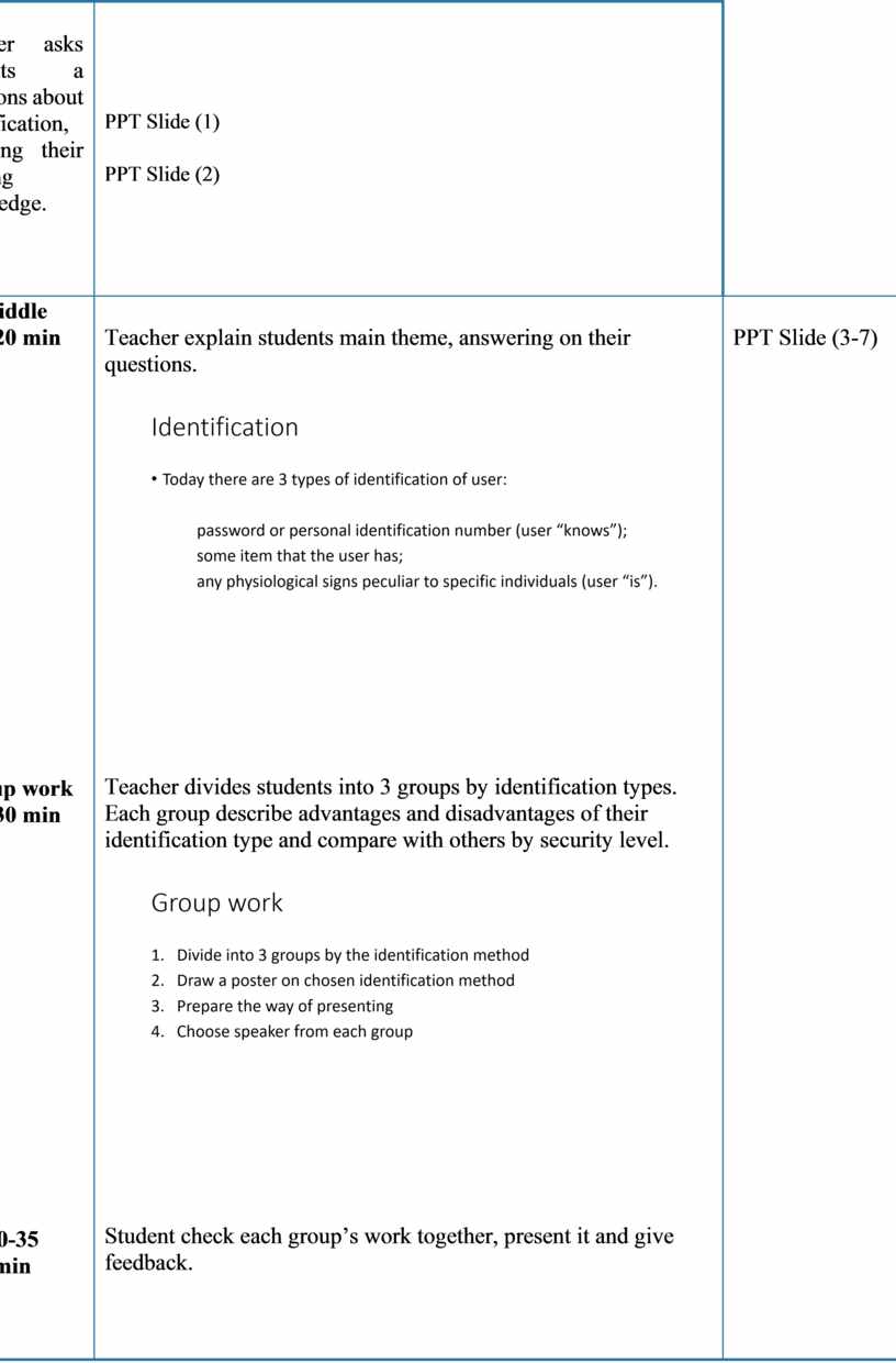Teacher divides students into 3 groups by identification types. Each group describe advantages and disadvantages of their identification type and compare with others by security level.