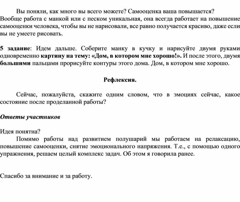 5 задание: Идем дальше. Соберите манку в кучку и нарисуйте двумя руками одновременно картину на тему: «Дом, в котором мне хорошо!». И после этого, двумя большими пальцами прорисуйте контуры этого дома. Дом, в котором мне хорошо.