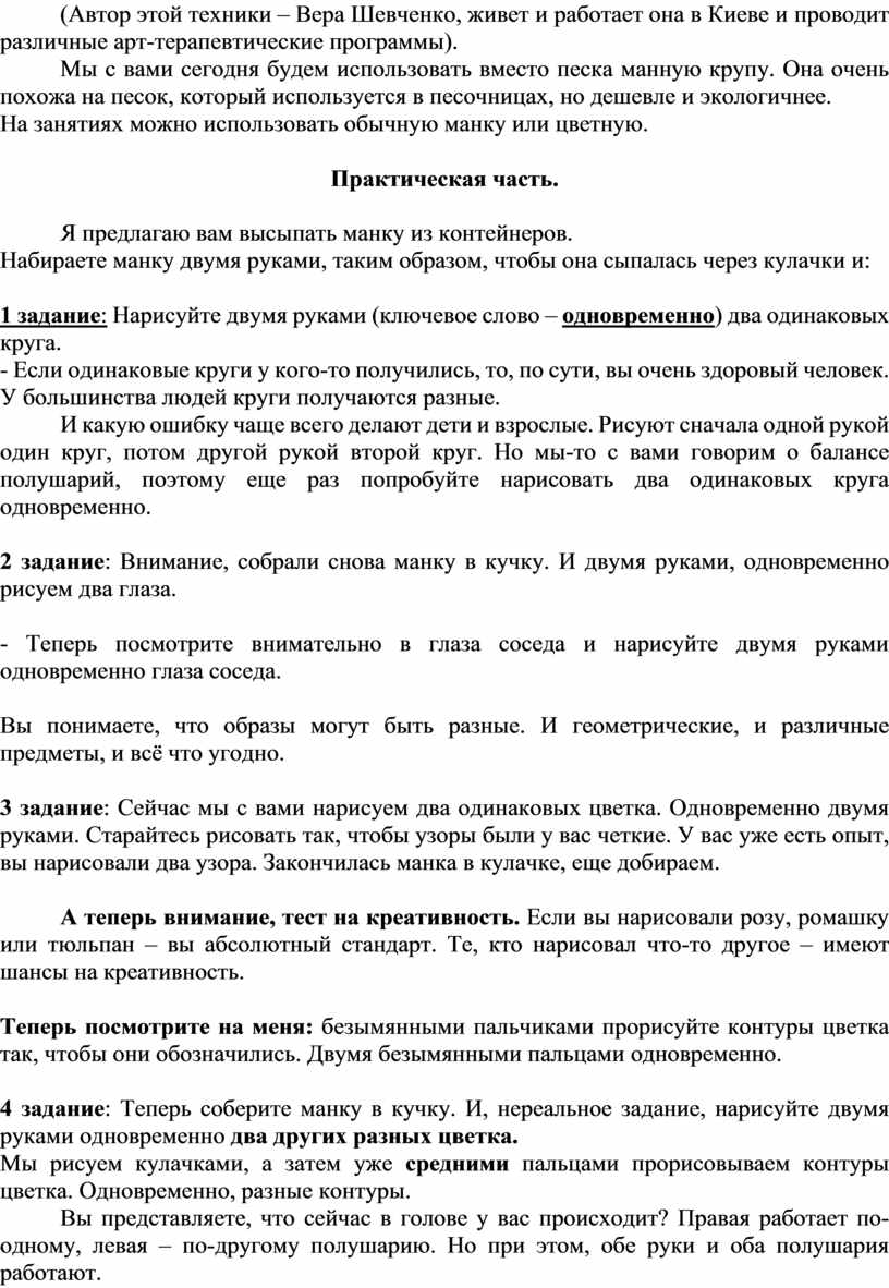 Мастер-класс, занятие для педагогов с использованием арт-терапии на тему: «Полушарное рисование песком»