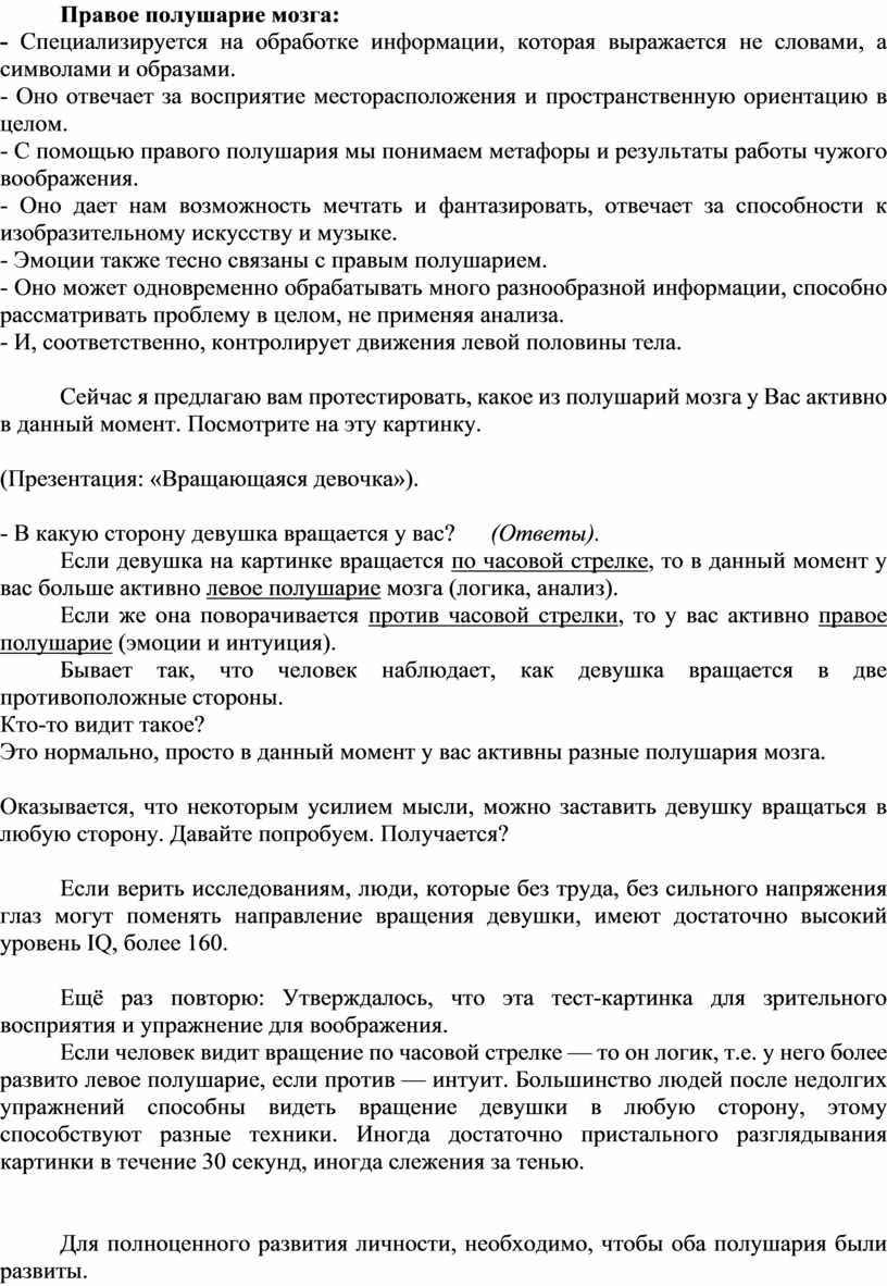 Если девушка на картинке вращается по часовой стрелке, то в данный момент у вас больше активно левое полушарие мозга (логика, анализ).