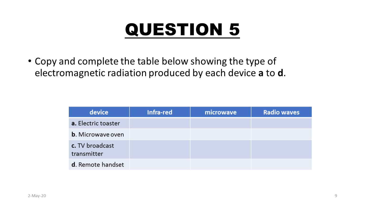 Copy and complete the table below showing the type of electromagnetic radiation produced by each device a to d.