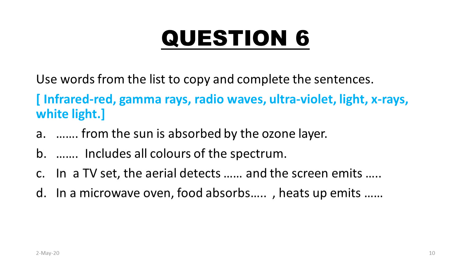 [ Infrared-red, gamma rays, radio waves, ultra-violet, light, x-rays, white light.]