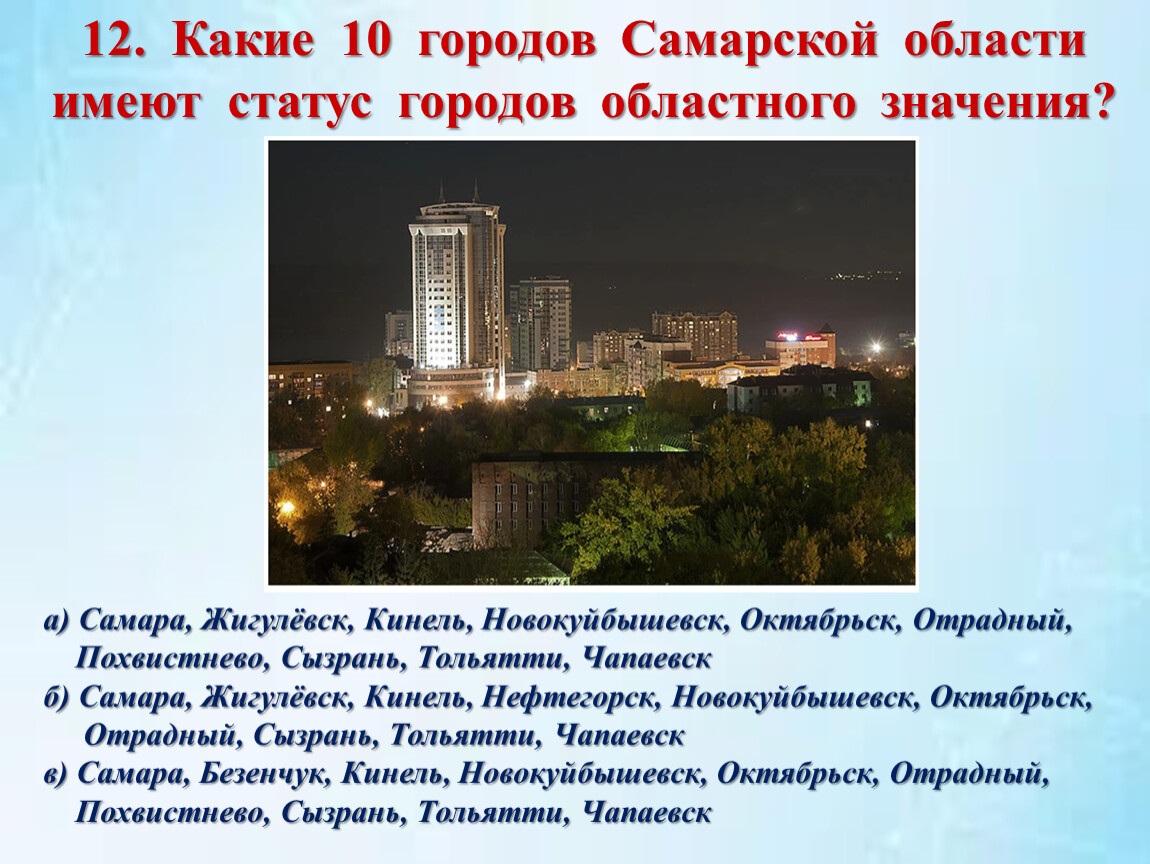 12. Какие 10 городов Самарской области имеют статус городов областного значения?