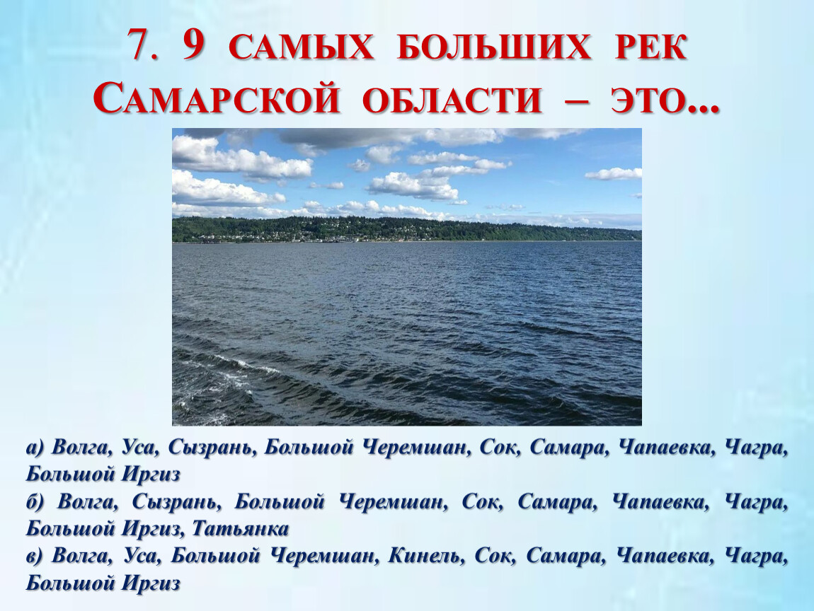 в) Волга, Уса, Большой Черемшан, Кинель, Сок, Самара, Чапаевка, Чагра, Большой Иргиз