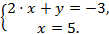 Например, возьмем два уравнения 2⋅x+y=−3 и x=5, после чего объединим фигурной скобкой такого плана: