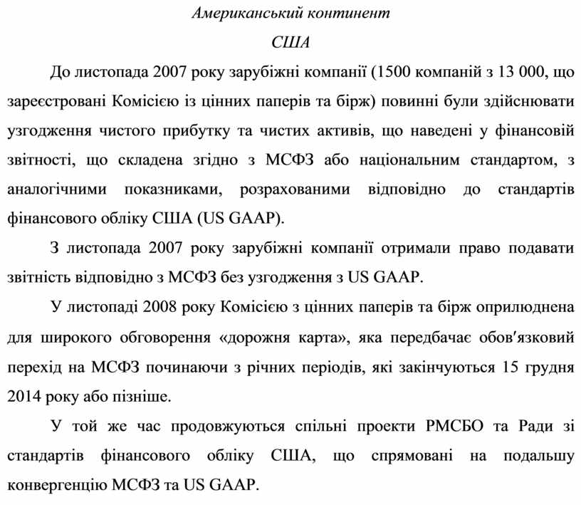 До листопада 2007 року зарубіжні компанії (1500 компаній з 13 000, що зареєстровані Комісією із цінних паперів та бірж) повинні були здійснювати узгодження чистого прибутку та чистих активів, що наведені у фінансовій звітності, що складена згідно з МСФЗ або національним стандартом, з аналогічними показниками, розрахованими відповідно до стандартів фінансового обліку США (US GAAP).