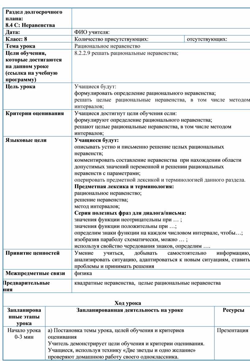 Учащиеся достигнут цели обучения если: формулируют определение рационального неравенства; решают целые рациональные неравенства, в том числе методом интервалов; |