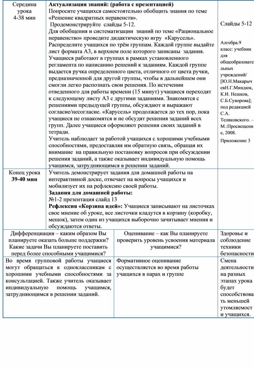 Актуализация знаний: (работа с презентацией) Попросите учащихся самостоятельно обобщить знания по теме «Решение квадратных неравенств». Продемонстрируйте слайды 5-12. Для обобщения и систематизации знаний по теме «Рациональное неравенство» проведите дидактическую игру «Карусель». Распределите учащихся по трём группам. Каждой группе выдайте лист формата А3, в верхнем поле которого записаны задания. Учащиеся работают в группах в рамках установленного регламента по написанию решений к заданиям. Каждой группе выдается ручка определенного цвета, отличного от цвета ручки, предназначенной для другой группы, чтобы в дальнейшем они смогли легко распознать свои решения. По истечении отведенного для работы времени (15 минут) учащиеся переходят к следующему листу А3 с другими заданиями. Знакомятся с решениями предыдущей группы, обсуждают и выражают согласие/несогласие. «Карусель» продолжается до тех пор, пока учащиеся не ознакомятся и не обсудят решения заданий всех групп. Далее учащиеся оформляют решения своих заданий в тетради. Учитель наблюдает за работой учащихся с хорошими учебными способностями, предоставляя им обратную связь, обращая их внимание на правильную постановку вопросов при обсуждении решения заданий, а также оказывает индивидуальную помощь учащимся, затрудняющимся в решении заданий. |