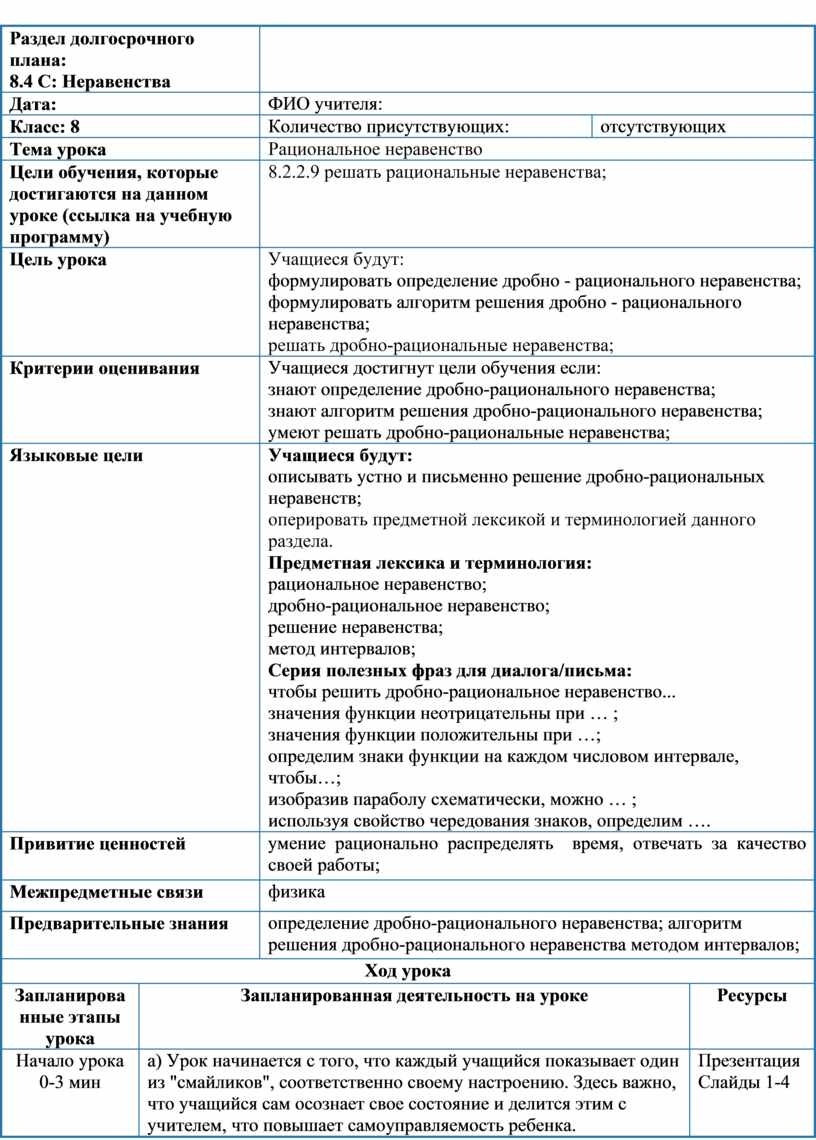 Учащиеся будут: описывать устно и письменно решение дробно-рациональных неравенств; оперировать предметной лексикой и терминологией данного раздела. Предметная лексика и терминология: рациональное неравенство; дробно-рациональное неравенство; решение неравенства; метод интервалов; Серия полезных фраз для диалога/письма: чтобы решить дробно-рациональное неравенство... значения функции неотрицательны при … ; значения функции положительны при …; определим знаки функции на каждом числовом интервале, чтобы…; изобразив параболу схематически, можно … ; используя свойство чередования знаков, определим …. |