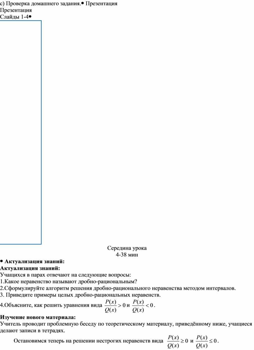 Актуализация знаний: Учащихся в парах отвечают на следующие вопросы: 1.Какое неравенство называют дробно-рациональным? 2.Сформулируйте алгоритм решения дробно-рационального неравенства методом интервалов. 3. Приведите примеры целых дробно-рациональных неравенств. 4.Объясните,