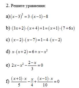 Учитель демонстрирует задания для домашней работы на интерактивной доске, отвечает на вопросы учащихся и мобилизует их на рефлексию своей работы. Задания для домашней работы 1. Решите уравнение: a) b) c) d) e) f) 2.