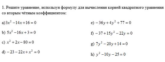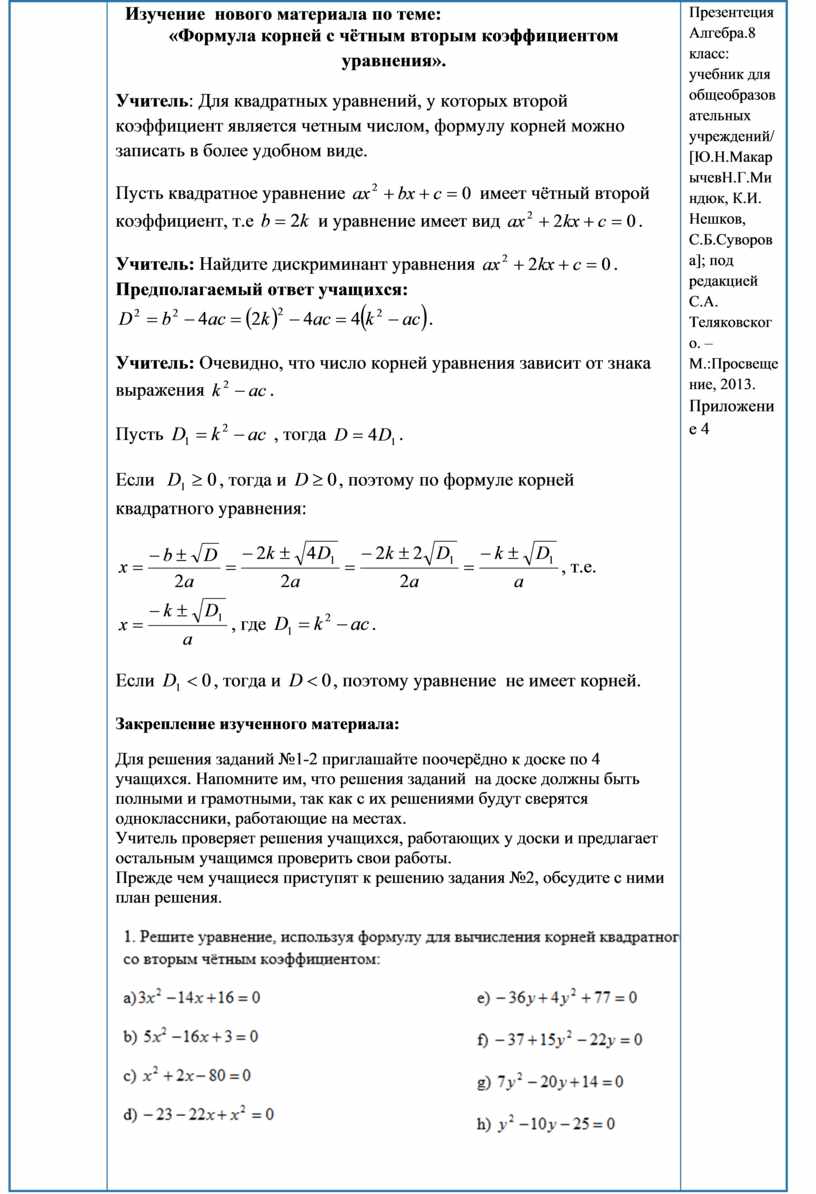 Учащиеся будут: знать формулу корней квадратного уравнения со вторым чётным коэффициентом; знать формулу для вычисления дискриминанта квадратного уравнения со вторым чётным коэффициентом; по дискриминанту квадратного уравнения определять, сколько оно имеет корней; знать алгоритм решения квадратного уравнения; применять формулу корней квадратного уравнения со вторым чётным коэффициентом; |