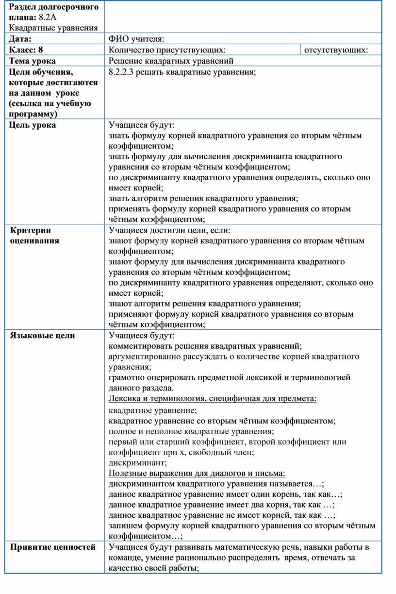 Учащиеся будут: комментировать решения квадратных уравнений; аргументированно рассуждать о количестве корней квадратного уравнения; грамотно оперировать предметной лексикой и терминологией данного раздела. Лексика и терминология, специфичная для предмета: квадратное уравнение; квадратное уравнение со вторым чётным коэффициентом; полное и неполное квадратные уравнения; первый или старший коэффициент, второй коэффициент или коэффициент при х, свободный член; дискриминант; Полезные выражения для диалогов и письма: дискриминантом квадратного уравнения называется…; данное квадратное уравнение имеет один корень, так как…; данное квадратное уравнение имеет два корня, так как …; данное квадратное уравнение не имеет корней, так как …; запишем формулу корней квадратного уравнения со вторым чётным коэффициентом…; |