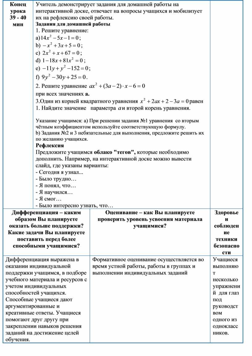 Указание учащимся: а) При решении задания №1 уравнения со вторым чётным коэффициентом используйте соответствующую формулу. b) Задания №2 и 3 небязательные для выполнения, предложите решить их по желанию учащихся. Рефлексия Предложите учащимся облако "тегов", которые необходимо дополнить. Например, на интерактивной доске можно вывести слайд, где указаны варианты: - Сегодня я узнал... - Было трудно… - Я понял, что… - Я научился… - Я смог… - Было интересно узнать, что… |