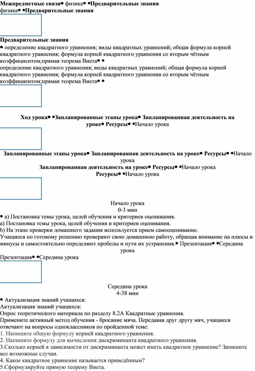 Учащиеся будут: аргументированно рассуждать о количестве корней приведённого квадратного уравнения; вести рассуждения о корнях квадратного уравнения, опираясь на теорему Виета; вести рассуждения о корнях квадратного уравнения, опираясь на теорему, обратную теореме Виета); оперировать предметной лексикой и терминологией данного раздела. Предметная лексика и терминология: приведённое квадратное уравнение; первый или старший коэффициент, второй коэффициент или коэффициент при х, свободный член; дискриминант; сумму корней приведённого квадратного уравнения; произведение корней приведённого квадратного уравнения; Серия полезных фраз для диалога/письма: найдём сумму корней приведённого квадратного уравнения…; найдём произведение корней приведённого квадратного уравнения…;корни данного квадратного уравнения одного знака, так как … ; корни данного квадратного уравнения разного знака, так как … ; |