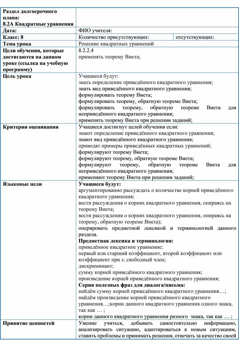 Учащиеся достигнут целей обучения если: знают определение приведённого квадратного уравнения; знают вид приведённого квадратного уравнения; приводят примеры приведённых квадратных уравнений; формулируют теорему Виета; формулируют теорему, обратную теореме Виета; формулируют теорему, обратную теореме Виета для неприведённого квадратного уравнения; применяют теорему Виета при решении заданий; |