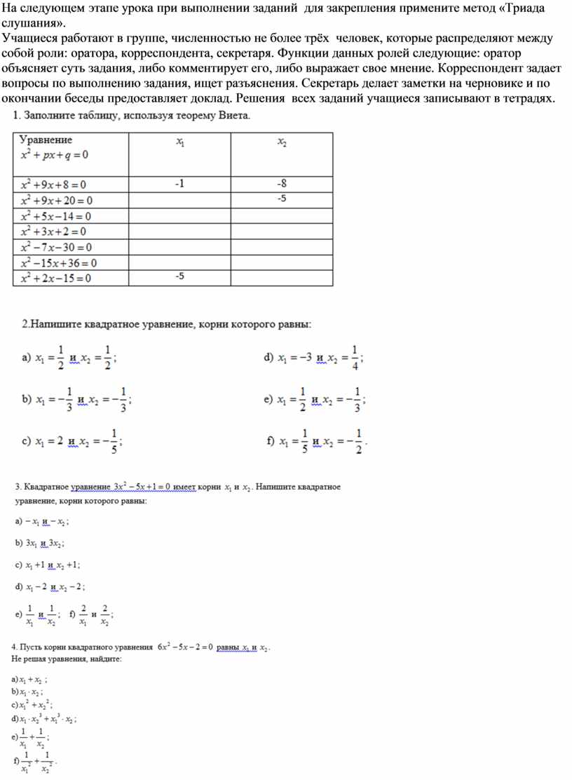 уравнения На следующем этапе урока при выполнении заданий для закрепления примените метод «Триада слушания». Учащиеся работают в группе, численностью не более трёх человек, которые распределяют между собой роли: оратора, корреспондента, секретаря. Функции данных ролей следующие: оратор объясняет суть задания, либо комментирует его, либо выражает свое мнение. Корреспондент задает вопросы по выполнению задания, ищет разъяснения. Секретарь делает заметки на черновике и по окончании беседы предоставляет доклад. Решения всех заданий учащиеся записывают в тетрадях.