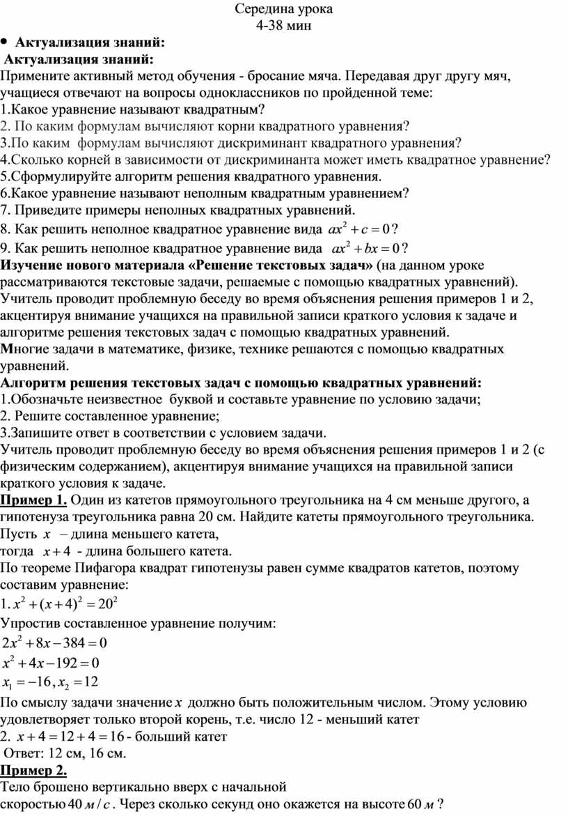 Актуализация знаний: Примените активный метод обучения - бросание мяча. Передавая друг другу мяч, учащиеся отвечают на вопросы одноклассников по пройденной теме: 1.Какое уравнение называют квадратным? 2. По каким формулам вычисляют корни квадратного уравнения? 3.По каким формулам вычисляют дискриминант квадратного уравнения? 4.Сколько корней в зависимости от дискриминанта может иметь квадратное уравнение? 5.Сформулируйте алгоритм решения квадратного уравнения. 6.Какое уравнение называют неполным квадратным уравнением? 7. Приведите примеры неполных квадратных уравнений. 8.
