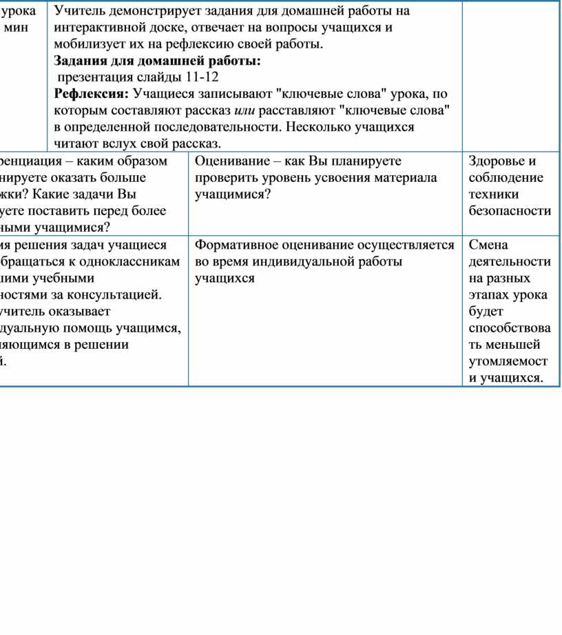 Учитель демонстрирует задания для домашней работы на интерактивной доске, отвечает на вопросы учащихся и мобилизует их на рефлексию своей работы. Задания для домашней работы: презентация слайды 11-12 Рефлексия: Учащиеся записывают "ключевые слова" урока, по которым составляют рассказ или расставляют "ключевые слова" в определенной последовательности. Несколько учащихся читают вслух свой рассказ. |