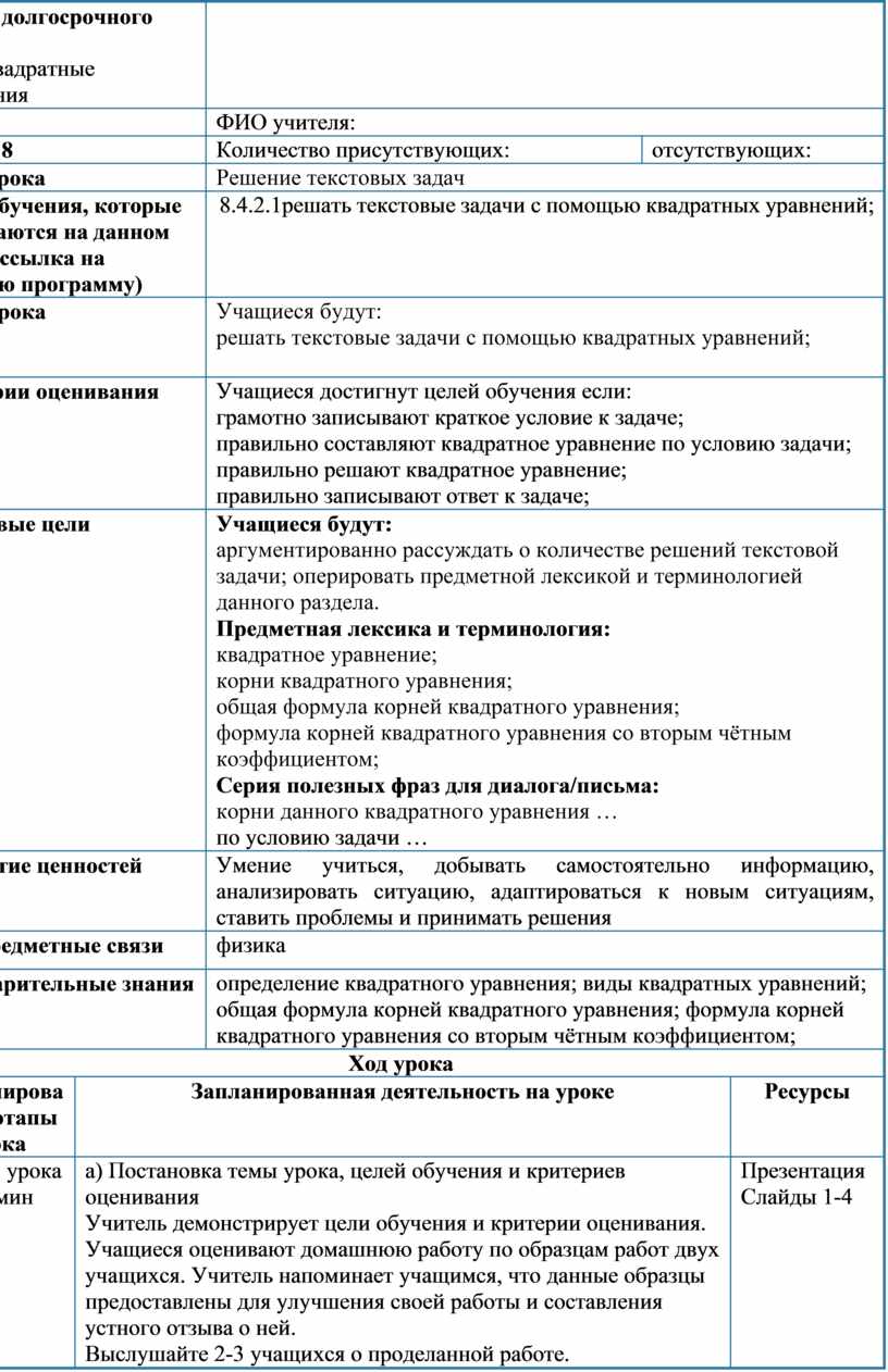 8.4.2.1решать текстовые задачи с помощью квадратных уравнений;