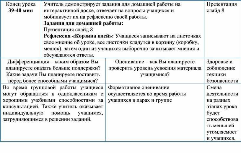 Учитель демонстрирует задания для домашней работы на интерактивной доске, отвечает на вопросы учащихся и мобилизует их на рефлексию своей работы. Задания для домашней работы: Презентация слайд 8 Рефлексия «Корзина идей»: Учащиеся записывают на листочках свое мнение об уроке, все листочки кладутся в корзину (коробку, мешок), затем один из учащихся выборочно зачитывает мнения и обсуждаются ответы. |
