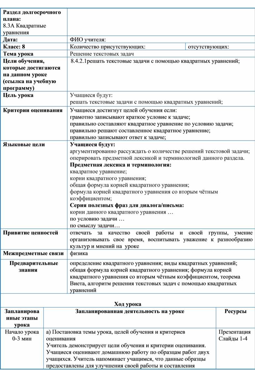 8.4.2.1решать текстовые задачи с помощью квадратных уравнений;