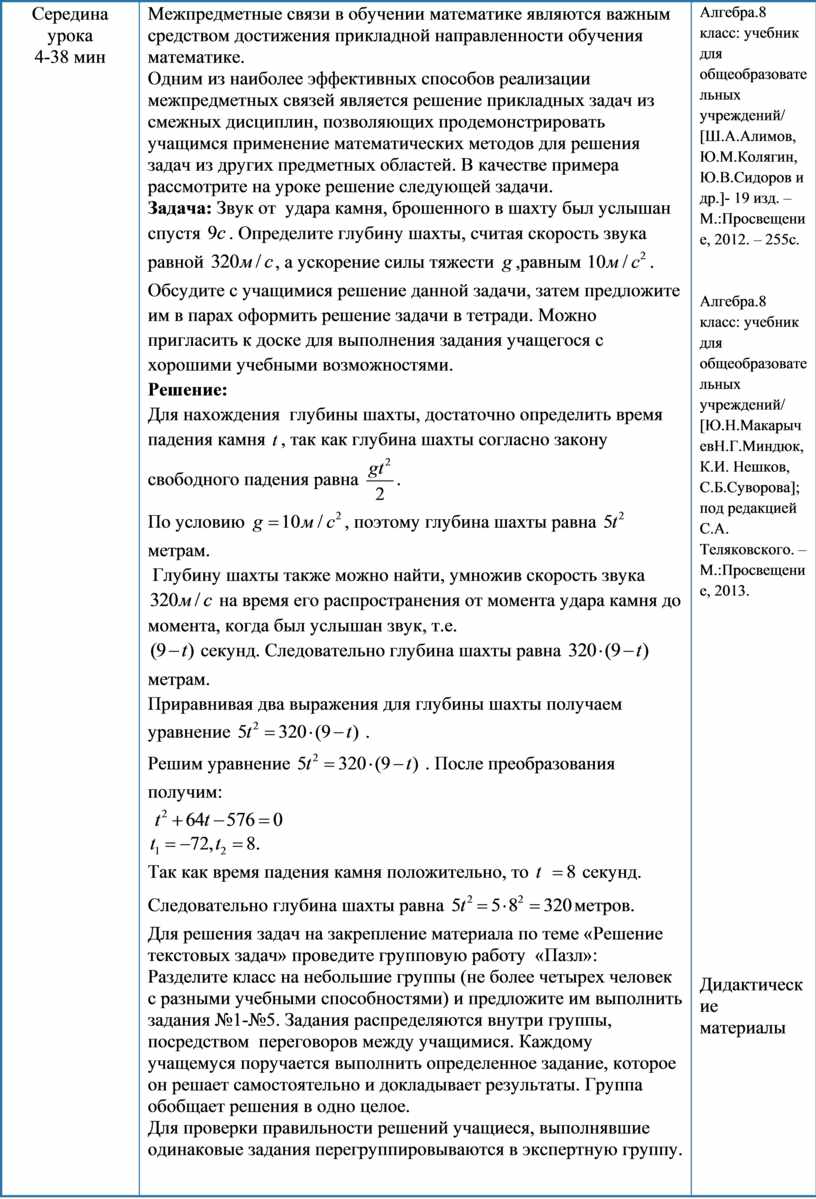 как время падения камня положительно, то Для решения задач на закрепление материала по теме «Решение текстовых задач» проведите групповую работу «Пазл»: Разделите класс на небольшие группы (не более четырех человек с разными учебными способностями) и предложите им выполнить задания №1-№5. Задания распределяются внутри группы, посредством переговоров между учащимися. Каждому учащемуся поручается выполнить определенное задание, которое он решает самостоятельно и докладывает результаты. Группа обобщает решения в одно целое. Для проверки правильности решений учащиеся, выполнявшие одинаковые задания перегруппировываются в экспертную группу. Во время групповой работы учитель наблюдает за работой учащихся в каждой группе и задает вопросы учащимся, которым необходима дополнительная поддержка. |