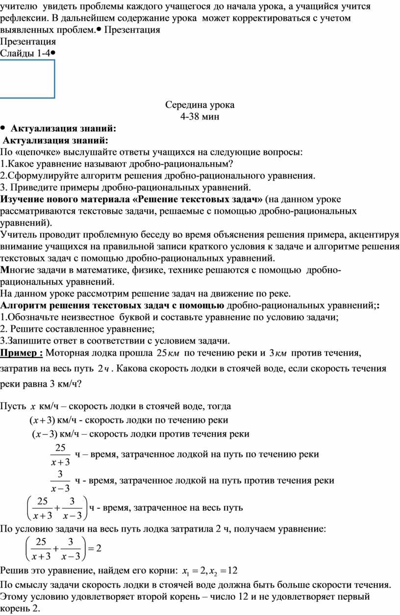 Актуализация знаний: По «цепочке» выслушайте ответы учащихся на следующие вопросы: 1.Какое уравнение называют дробно-рациональным? 2.Сформулируйте алгоритм решения дробно-рационального уравнения. 3. Приведите примеры дробно-рациональных уравнений. Изучение нового материала «Решение текстовых задач» (на данном уроке рассматриваются текстовые задачи, решаемые с помощью дробно-рациональных уравнений). Учитель проводит проблемную беседу во время объяснения решения примера, акцентируя внимание учащихся на правильной записи краткого условия к задаче и алгоритме решения текстовых задач с помощью дробно-рациональных уравнений. Многие задачи в математике, физике, технике решаются с помощью дробно-рациональных уравнений. На данном уроке рассмотрим решение задач на движение по реке. Алгоритм решения текстовых задач с помощью дробно-рациональных уравнений;: 1.Обозначьте неизвестное буквой и составьте уравнение по условию задачи; 2. Решите составленное уравнение; 3.Запишите ответ в соответствии с условием задачи. Пример :