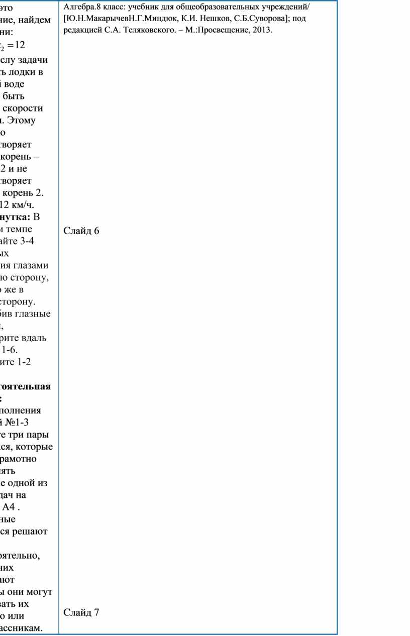 это уравнение, найдем его корни: По смыслу задачи скорость лодки в стоячей воде должна быть больше скорости течения. Этому условию удовлетворяет второй корень – число 12 и не удовлетворяет первый корень 2. Ответ: 12 км/ч. Физминутка: В среднем темпе проделайте 3-4 круговых движения глазами в правую сторону, столько же в левую сторону. Расслабив глазные мышцы, посмотрите вдаль на счет 1-6. Повторите 1-2 раза. Самостоятельная работа: Для выполнения заданий №1-3 создайте три пары учащихся, которые будут грамотно оформлять решение одной из трёх задач на листах А4 . Остальные учащиеся решают задачи самостоятельно, если у них возникают вопросы они могут адресовать их учителю или одноклассникам. Через 10 минут учитель проверяет решения каждой из трёх пар, сканирует их решения. Далее шесть учащихся выполняют другие два задания в тетради. Проверка решений выполняется по готовому решению на интерактивной доске. |