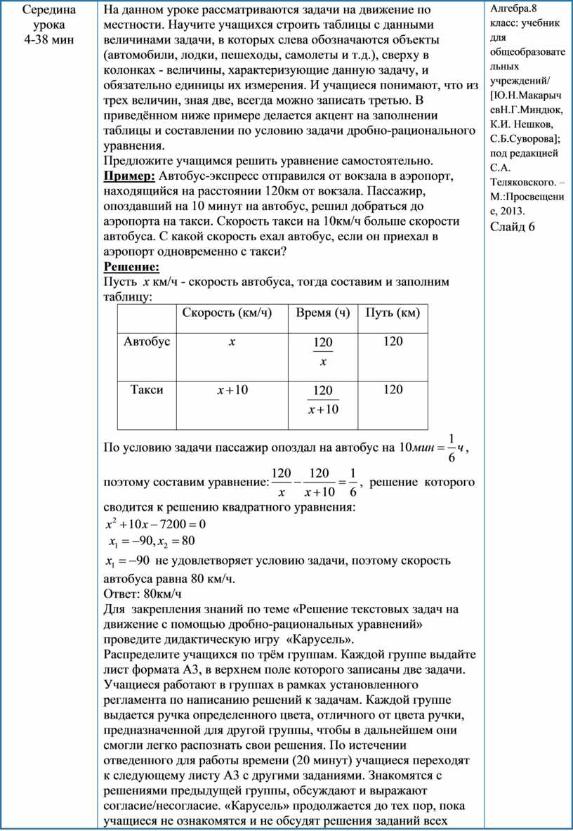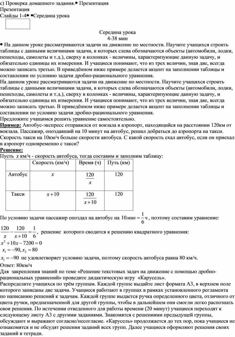 На данном уроке рассматриваются задачи на движение по местности. Научите учащихся строить таблицы с данными величинами задачи, в которых слева обозначаются объекты (автомобили, лодки, пешеходы, самолеты и т.д.), сверху в колонках - величины, характеризующие данную задачу, и обязательно единицы их измерения. И учащиеся понимают, что из трех величин, зная две, всегда можно записать третью. В приведённом ниже примере делается акцент на заполнении таблицы и составлении по условию задачи дробно-рационального уравнения. Предложите учащимся решить уравнение самостоятельно. Пример: Автобус-экспресс отправился от вокзала в аэропорт, находящийся на расстоянии 120км от вокзала. Пассажир, опоздавший на 10 минут на автобус, решил добраться до аэропорта на такси. Скорость такси на 10км/ч больше скорости автобуса. С какой скорость ехал автобус, если он приехал в аэропорт одновременно с такси? Решение: Пусть х км/ч - скорость автобуса, тогда составим и заполним таблицу: