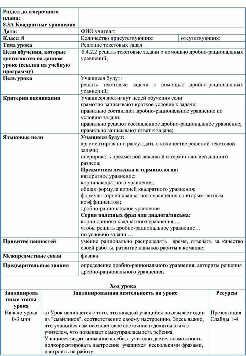 Учащиеся достигнут целей обучения если: грамотно записывают краткое условие к задаче; правильно составляют дробно-рациональное уравнение по условию задачи; правильно решают составленное дробно-рациональное уравнение; правильно записывают ответ к задаче; |
