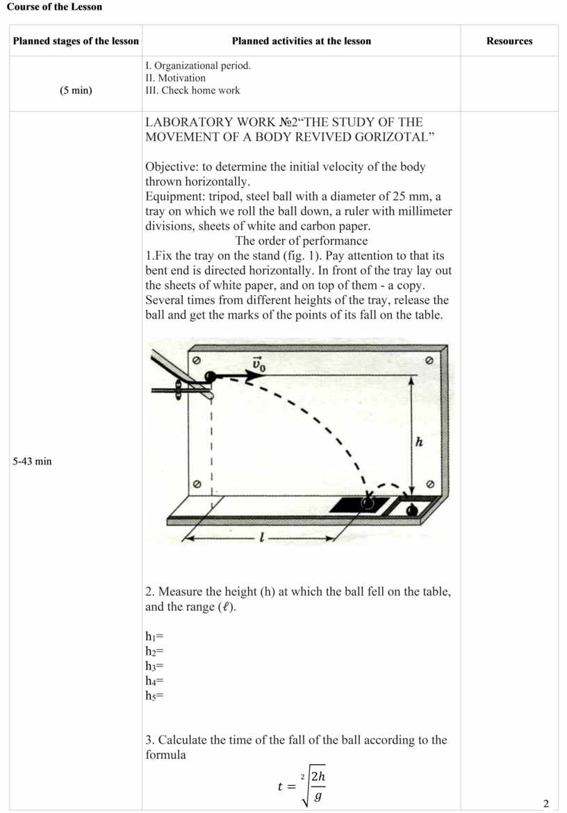 LABORATORY WORK №2“THE STUDY OF THE MOVEMENT OF A BODY REVIVED GORIZOTAL”